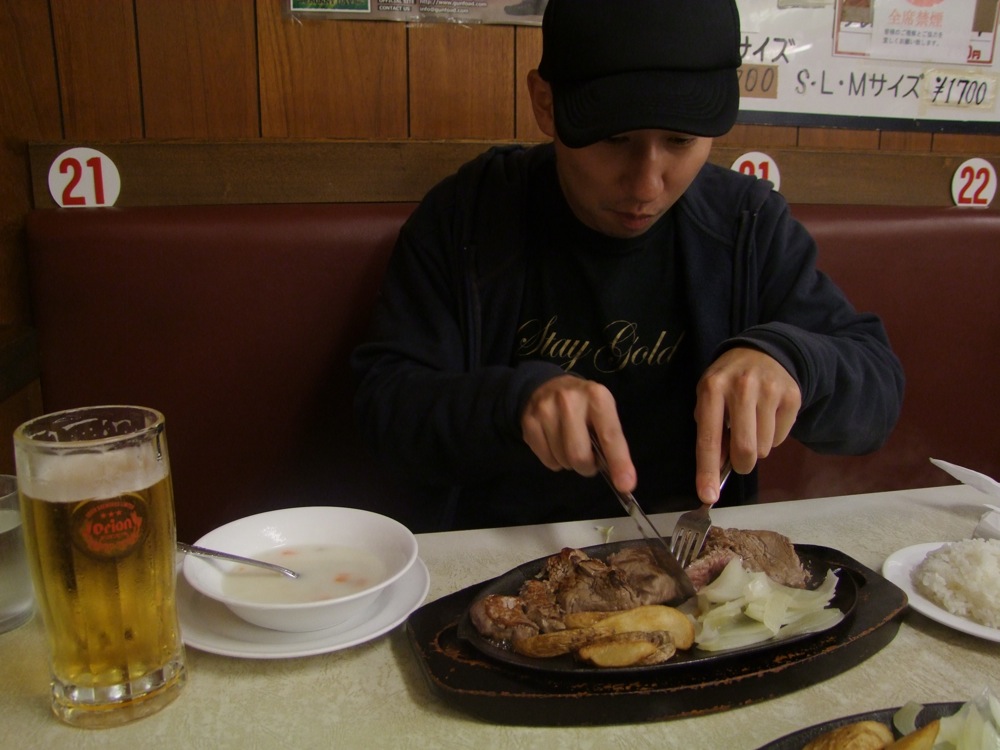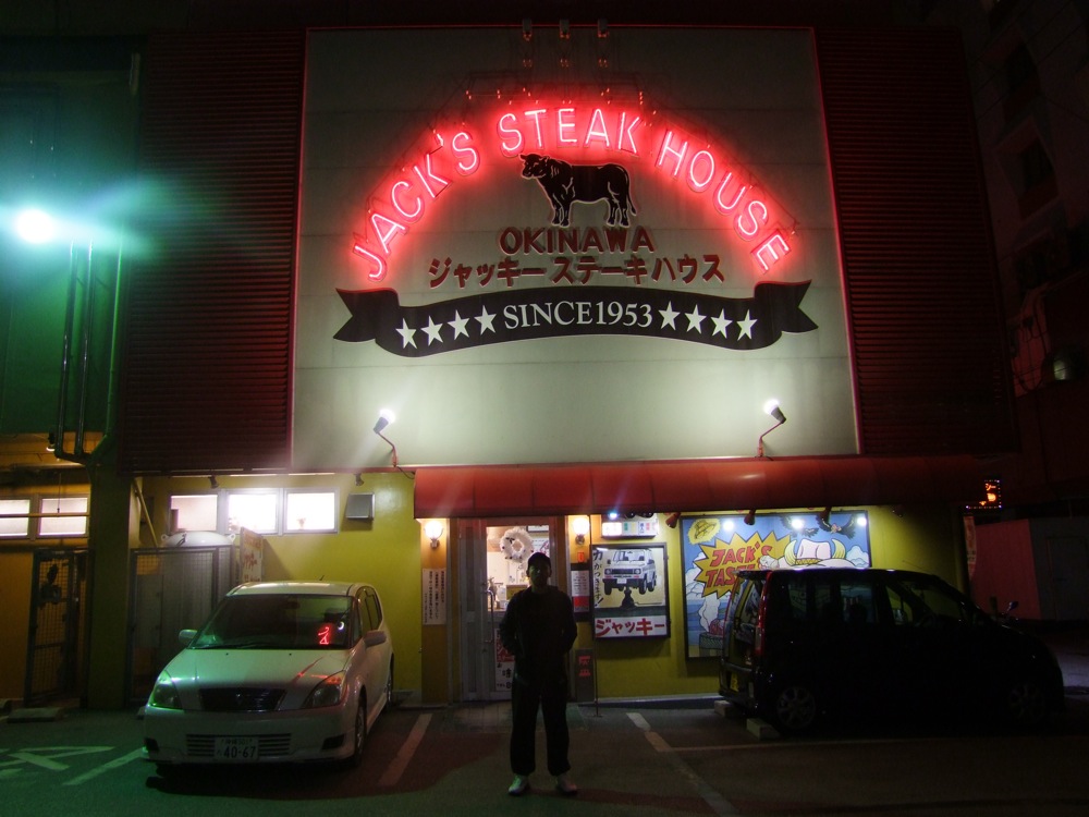 この日の予定はレンタカーを借りて、平敷屋(へしきや)にある、そろそろお馴染みとなりつつある(笑)、西仲家の別邸まで行くのみでした。次の日の学校公演の場所が名護と遠く、しかも朝が早いので、平敷屋の方がまだその場所に近かったからです。そのまま向かっても良かったのですが、実はトシさん、沖縄訪問が今回が初との事…。今回のスケジュール的に、平敷屋の後にすぐに名護に向かい、3ヶ所の学校公演が終わると、そのまま那覇空港に戻ってきて石垣島に向かってしまう為、いわゆる沖縄中心地である那覇市には全く立ち寄らない事になってしまうのですが、それも何だか勿体無いので、沖縄にようこその意味を込めて、那覇市内にあるステーキハウス、ジャッキーステーキハウスで、早めの夕食をとる事にしました。そもそもステーキが大好きというトシさんには、これ以上は無いウェルカム・ディナー?になった事でしょう(笑)。ビールも飲んで(自分は運転の為、ここでは我慢でした…笑)、それはそれはご満悦でした。