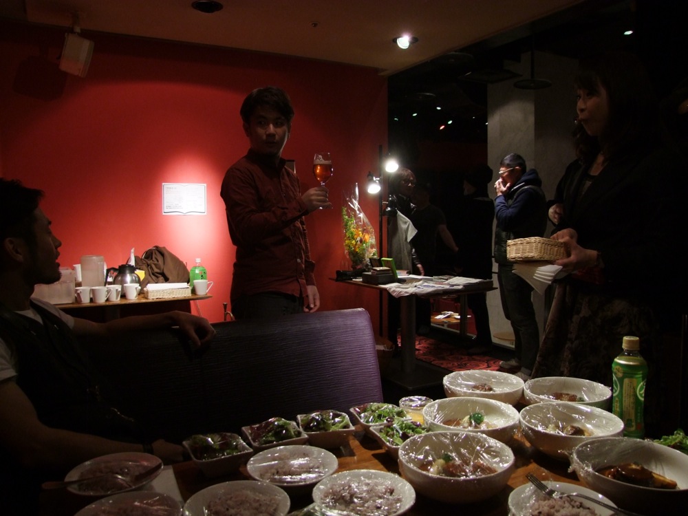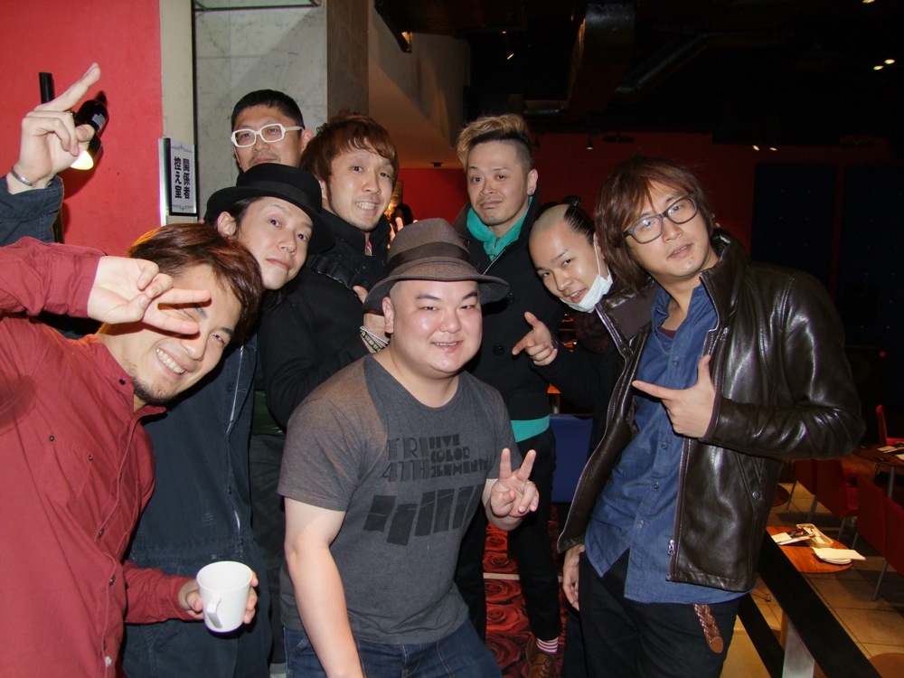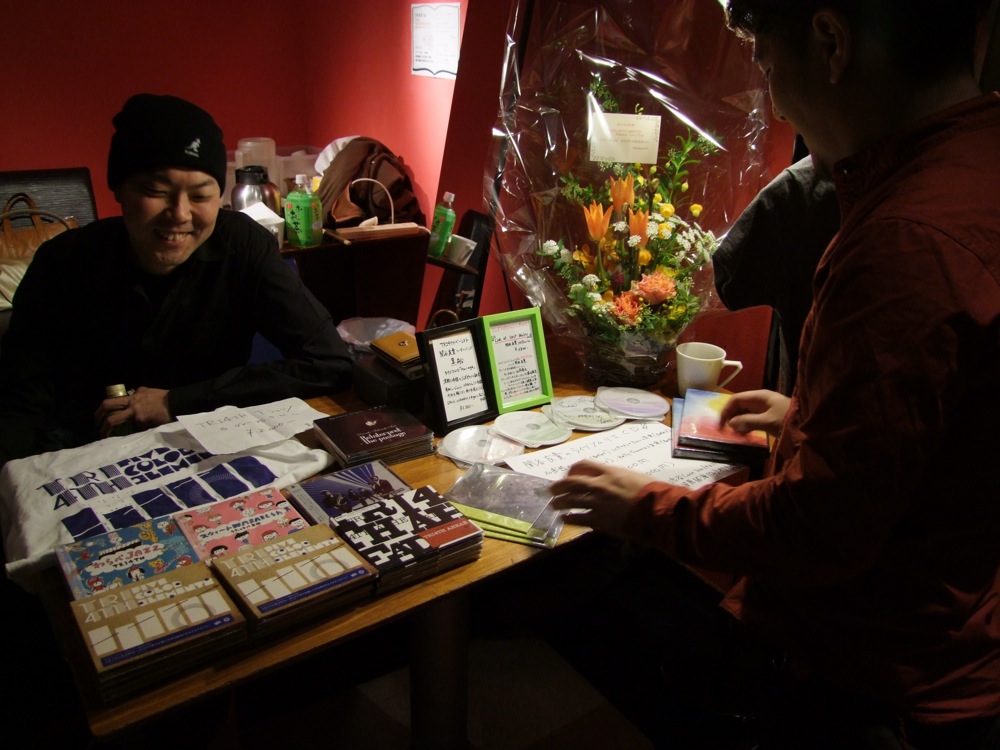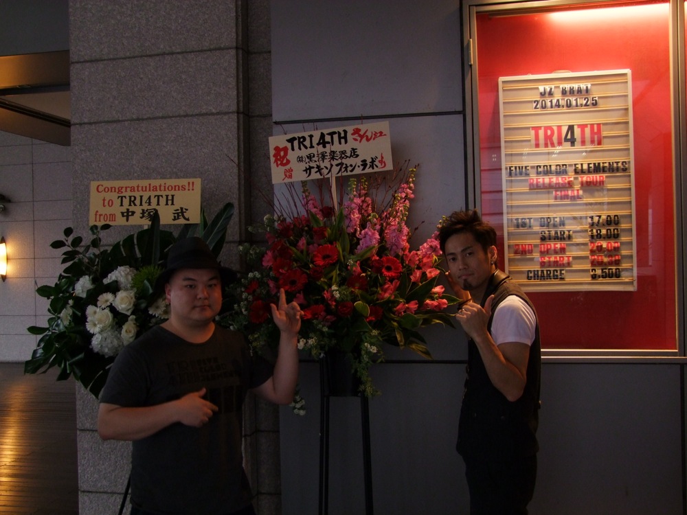 当日、会場の Jz Brat に足を踏み入れる前に、エントランスにお花が飾られていたのを見て、いよいよ今日がファイナルである事を実感させられました。リハーサルも入念に行いましたが、本番に備える余力は残していきたいところでした。今回は1部、2部の入れ替え制となっていまして、それぞれに同じくらいの見せ場を残したいところで、それは今日1日が長丁場である事も意味していました。リハーサルの時点で、その日のペース配分も考えなければいけないわけで、ある意味で、じっくりと自分達自身も楽しみたかったのかもしれません。リハーサル後、自分達と同じく近場でライブをこの日行うという、カルメラのメンバーも激励に駆け付けてくれ(左下写真参照)、こちらも元気が湧き出てきました。思えば、こうして TRI4TH のメンバーは、様々な場所で多くの方々に助けを貰って、ここまでやってこれたのかもしれません。今回はツアー中の恩返しも含めて、皆で1つのライブを作り上げるべくやっていきたいと思ったものでした。