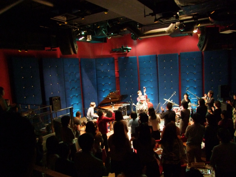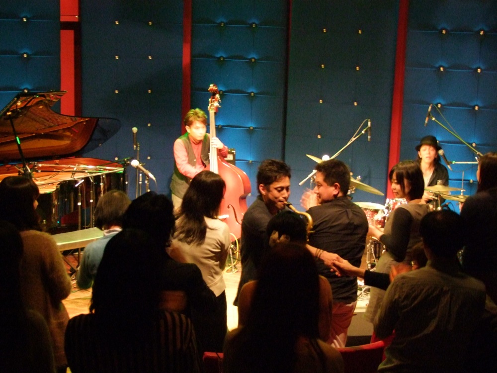 トランペットの織田君がカウベルを鳴らしながら、そして藤田君がサックスを吹きながら客席から登場し始めました。本当に本当に最後の曲、“Dance 'em All”です。ドラムのタカオさんの「踊ろうぜ!!」の掛け声も、このツアー中に何度聴いて、そして頼もしく感じできた事か…。これこそ悔いの無いように、ただただ全力で演奏していくのみでした。楽しかった…。お客さんも皆で笑顔になってくれて、こちらも自然に笑顔になります。その雰囲気が良かったのです。