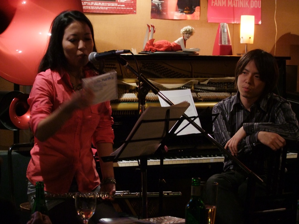 そして2ステージ目は前述の通り、西仲さんのオリジナル曲を中心にお届けしました。この時には、昨年の9月に発売したCD『あかばなーのうた』の宣伝もさせて頂きましたが(左下写真参照)、面白いのは、このCDは沖縄民謡をジャズアレンジした曲をメインとしている事です。つまり、オリジナル曲は実は1曲しか入っていないのですが、沖縄民謡というのと、西仲さんのオリジナル曲…というのが上手い具合にリンクしていて、特に違和感無く受け入れられたように思ったのです…。西仲さんの作る曲も、ある意味で沖縄で生まれた曲…という事になりますし、その意味では『あかばなーのうた』のインパクトそのままのステージになっていたのかもしれませんね。お客さんも楽しんでくれたようですし、自分達としても遣り甲斐がありました。