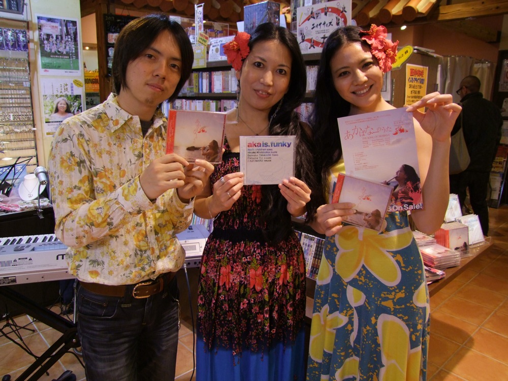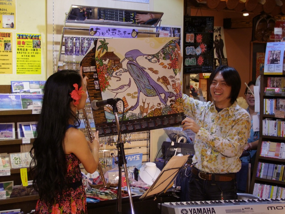 インストアライブという事で、やはりCDに収録されている曲を中心に、ライブを展開させていきます。前述の『あかばなーのうた』もそうですが、西仲さんにとって最初のCDともなった『aka is. funky』も忘れてはいけません。…また、今回、このCDのイラストを書いて下さった方のクジラポスターが、座間味村の村長から提供されており、早い者勝ちで(笑)お客さん方にプレゼントするという一幕もありました(右上写真参照)。3月中旬という、まだそんなに暖かい時期ではなかったものの、早速店内は沖縄の陽気で熱が伝わってきたものでした(笑)。