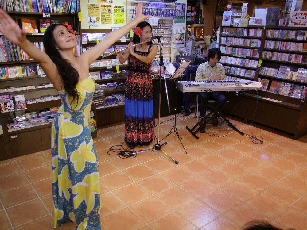 ここでも基本はデュオ編成だったのですが、1曲だけ、沖縄出身のフラダンサー、石川麻衣子さんとのコラボを披露させて頂きました。演奏とフラダンスという、なかなか興味深いコラボでしたが、曲は古謝美佐子さん(何気に、左上写真のポスターに写っていますね…笑)の“童神”を演奏し、歌詞を意識した振り付けが素敵な空間を作り出していました。ゆったりとした時間と、沖縄という場所の力強さを感じてくれたのではないでしょうか。短い時間でしたが、変化の多いステージでもあったと思います。