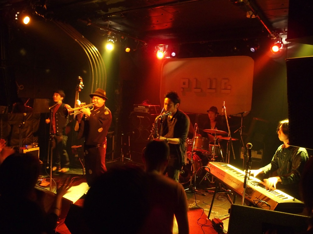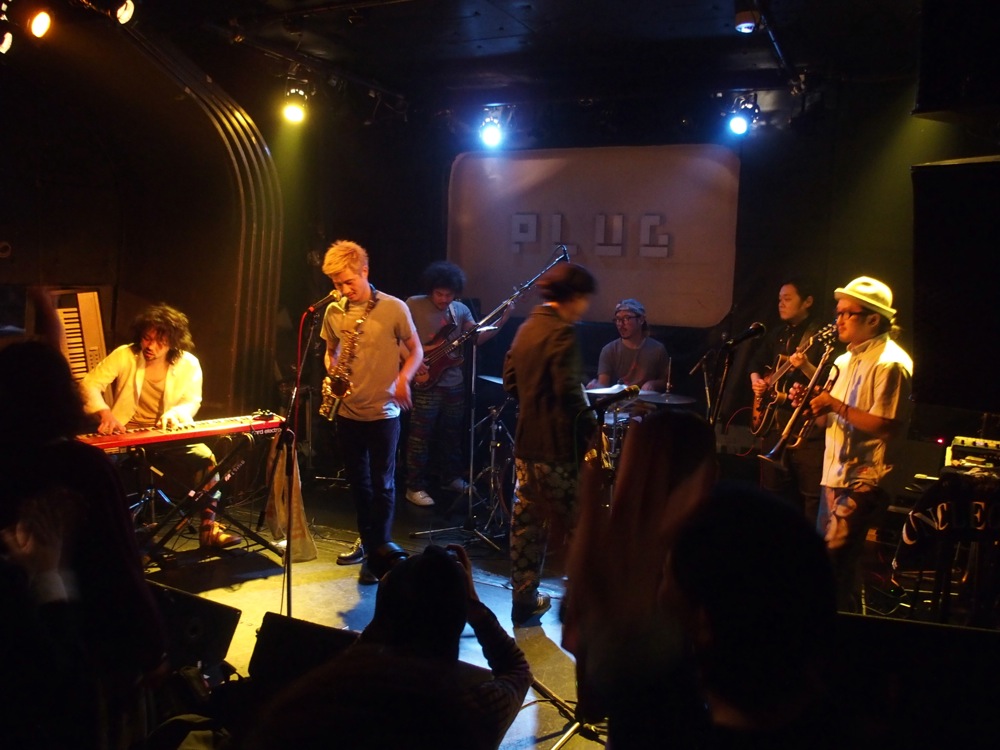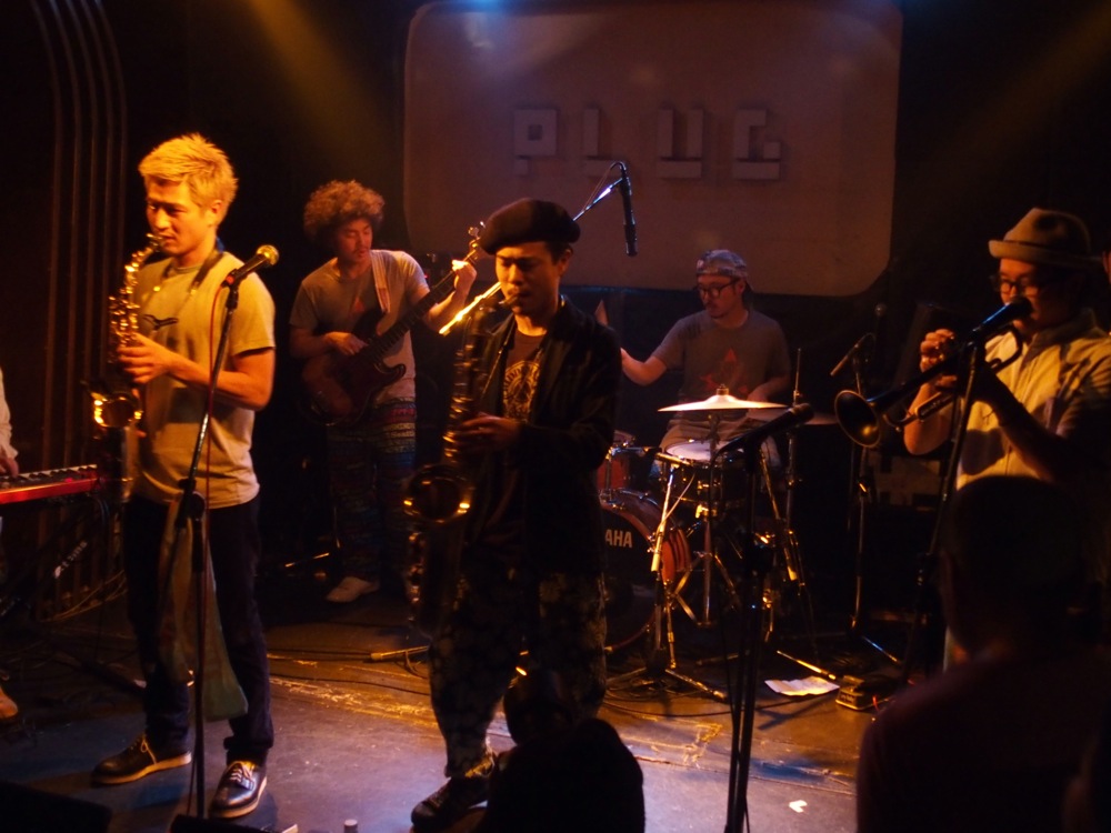 そして2バンド目に RIDDIMATES(リディメイツ)。サックス2管にトランペット1管の6人編成に、今回はギター・サポートも加えた7人編成で出演して頂き、楽しいパフォーマンスと厚みのあるサウンドでお客さんを魅了していました。音楽もファンキーで素直に格好良く、ずっと聴いていて心地良くなれるのは、確かな技術があっての事だと思いました。会場も、徐々に徐々に熱気が高まってきた事でしょう。