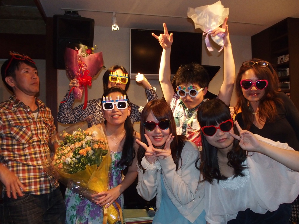 この日が一番誕生日に近かった事もあり、お祝いで駆け付けてくれたお客さんも多く、自分達にとって非常に珍しい方も突然遊びに来たりして頂いて、驚いた反面、とても嬉しかったです。最後には皆でバースデー眼鏡で写真を撮ったりして(右上写真参照)、多くの方と良い時間を過ごせたと思いました。どうもありがとうございました!
