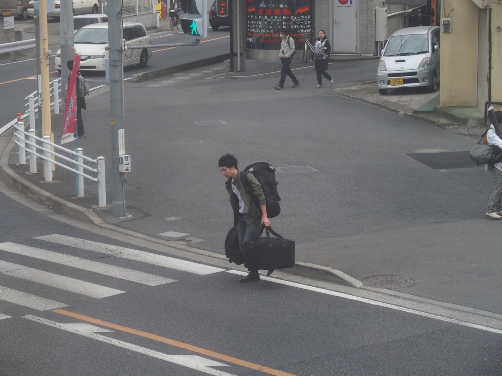 それまでの音楽感を踏襲しつつも、どこかで聴き馴染みのあるような曲も入れながら、誰にでも聴きやすいライブを目指す…といった感じでしょうか。確かに、ディズニーやジブリの曲も入れたので、以前とは異なったコンセプトもあるのでしょうが、やはり基本的には、ミキヤのこれまで培ってきた音楽を外に披露する場…というのが大きな意味を持つライブでもありましょう。まだまだライブの本数は多いとは言えないミキヤですから、今は1回1回のライブが本当に大切な時期でもあるのです。…とは言え、そんな今日は早速ミキヤの遅刻から始まりまして(笑)、ジャンベを担いでお店に向かう彼を盗撮したものでした(左下写真参照)。まだまだ放ってはおけない彼なのです(笑)。