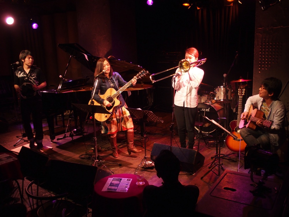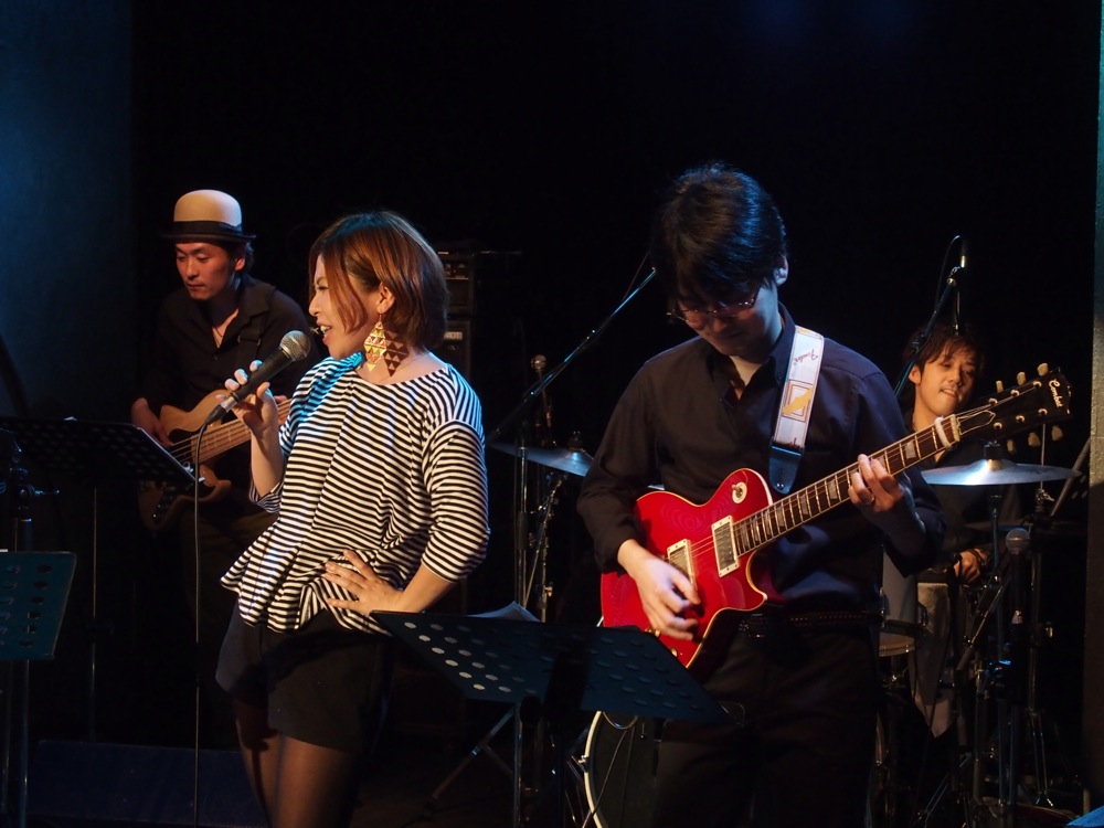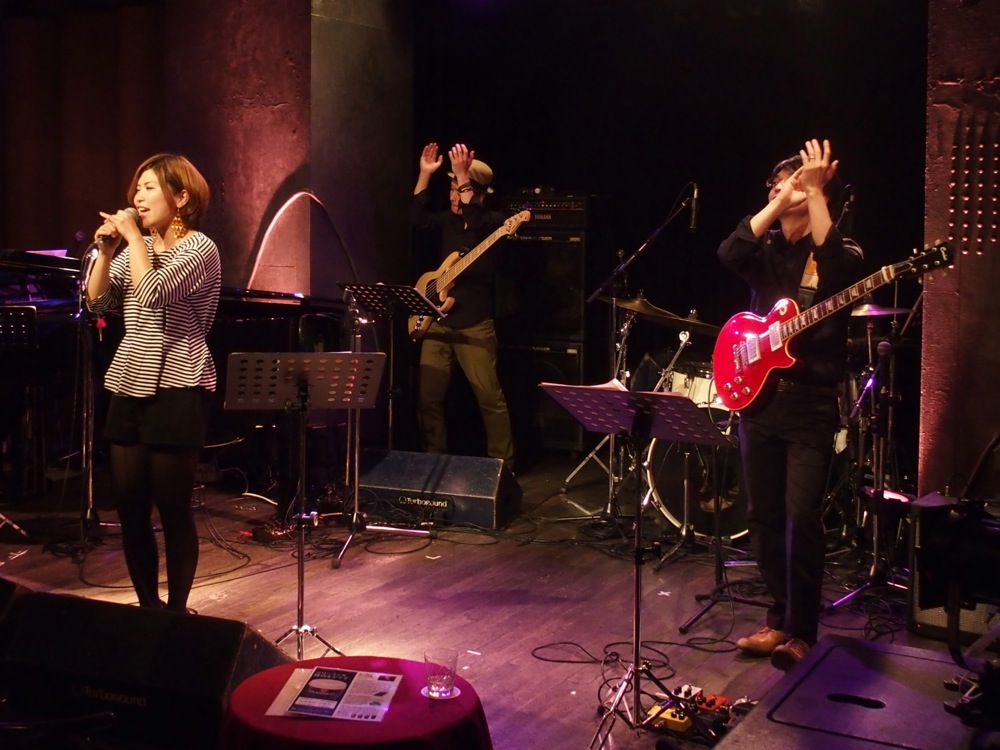 …そんな流れもあって、3番目と今回最後の出番だった自分達のステージも、非常に和やかなムードで始まったように思いました。初めは緩い感じから、徐々に勢いを付けていくような流れを盛り込み、3曲目には早速新曲、“恋の Satisfaction”をお送りします。途中にはクラップを入れたりして(左下写真参照)、お客さんにも手伝って頂いたりして、また一段階盛り上がった感じに進めていけたのではないかと思います。
