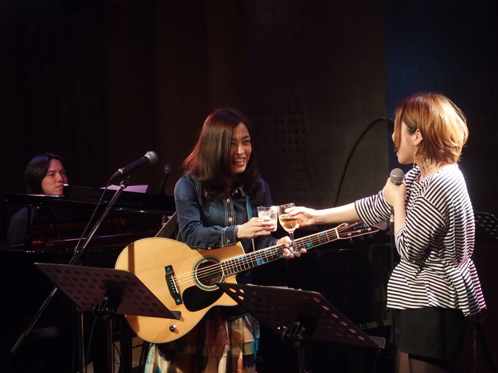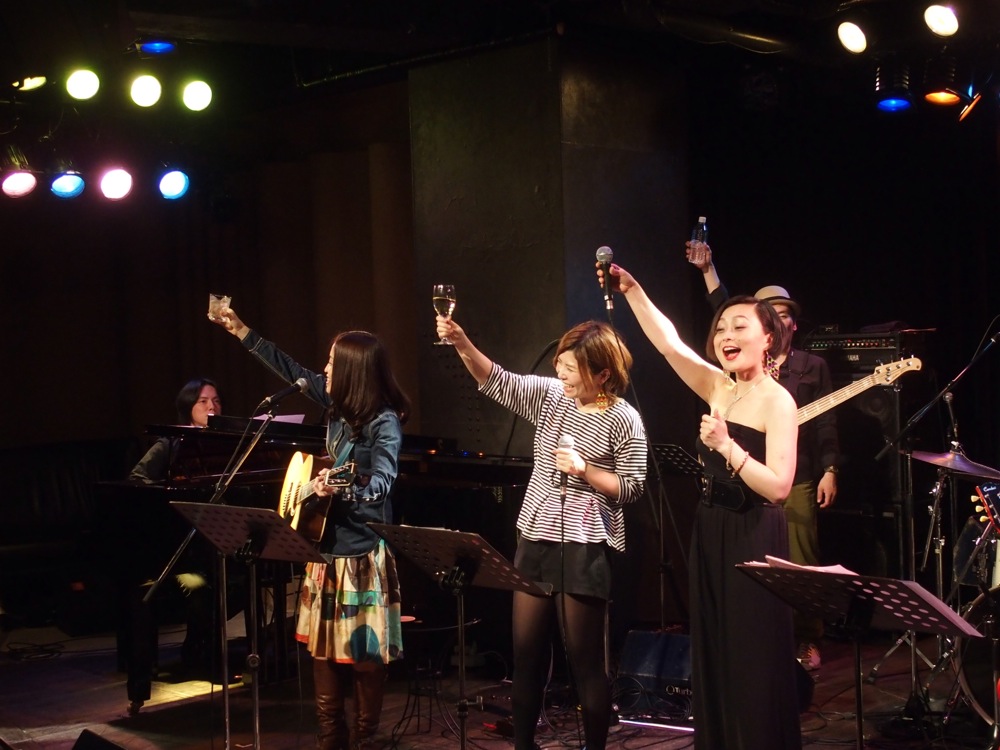 そして勿論アンコールへとなだれ込みます。ここで、黒崎さん、Usshy さん双方を呼び出し、何故か皆で乾杯をしてから(上写真参照…笑)、最後の最後の全員でのコラボ曲、泉谷しげる氏の“春夏秋冬”を皆で歌い、締めの時間とさせて頂きました。この曲は、シンプルな曲ではありますが、シンプルなだけに、それぞれの声が個性的に響く曲でもあったようにも思いました。そして改めて、“春歌酒党話参会”というタイトルも響いた時間になったのでした。