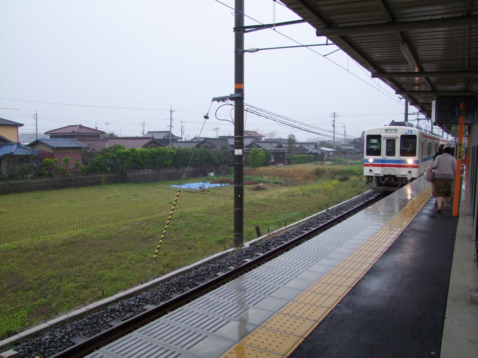 電車は2両編成で、これは典型的なローカル線です。車内は、朝特有の気だるい空気が流れていて、1つ1つの駅に停まっては発車していくという作業が、何だかまったりとしたムードで過ぎていきました。列車の右手には海も見えるのですが、雨という天気の為、何が何だかハッキリとは分からない感じです…。正に“地元”な時間がそこにはあり、車内にいるお客さんも、まさか自分が今朝羽田からやってきたお客だとは思ってなかったに違いありません。