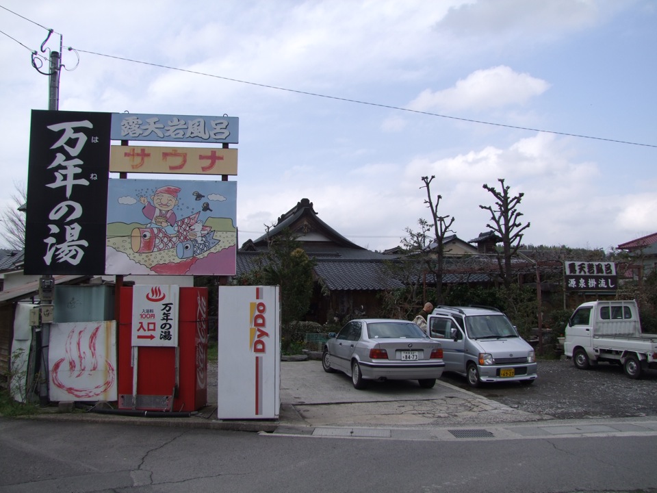 そこは“万年の湯”という場所で、特に山奥にあるような感じではなく、ある意味?市街地の中にポツンと佇んでいる感じでした。番頭さんがいるわけでもないようで、入口にお金を入れる所があって、そこに半ば自己申告的に(笑)100円を入れるだけでした。中に入ってみると確かに露天で、2つのお風呂があり、これで100円は確かに安いです。写真は男性用ですが(当たり前です…笑)。女性用は一応建物に包まれているので、これはこれで問題は無いでしょう…。もちろん設備的には何もありませんが、かえってそれが情緒的なムードを漂わせてて良いかなとも思いました。思う存分寛げました♪