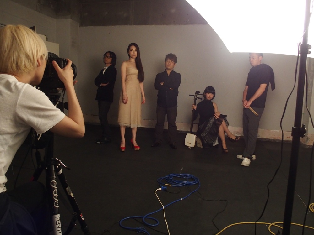 基本的にはモノトーンの仕様になるようで、ボーカルの里アンナさん以外のメンバーは黒色を基調として臨みました。また、津軽三味線の白藤ひかりさんは黒のボブカットのカツラを付け、自分も眼鏡を掛け、髪型も少しパーマをあてて貰います。ドラムのトシさんは、予想以上にラフな格好となり、リーダー関谷君も本人の希望である『Cool』系に?して貰っていました。普段とは違う感じではありますが、どこかしら個人の潜在性を引き出した印象にも導く事ができ、そして写真を確認しつつ、皆で作り上げていく感じの流れも出てきていたように思います。