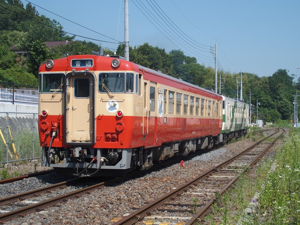 烏山線は列車の本数が少ないので、手前の駅から順に“さんぽ”を進めていくと、どうも効率が悪くなってしまう事が分かっていました。…なので今回は、なるべく効率の良い“さんぽ”をするべく、路線を行ったり来たりしながら向かわせて頂きたいと思います。本数が少ないとは言え、路線延長が短いので可能なやり方とも言えましょう。…という事で、まず降りたのは大金という駅でした。この駅は、再度訪れる事になりますが、まずは大金駅から次の小塙駅まで“さんぽ”をしてみましょう。大金駅は、単線の烏山線で唯一列車の交換が出来る駅で、早速旧国鉄2色塗装に塗られたキハ40形を見る事が出来ました(右下写真参照)。ちなみに、白色の車両が、烏山線用に塗られた塗装であります。