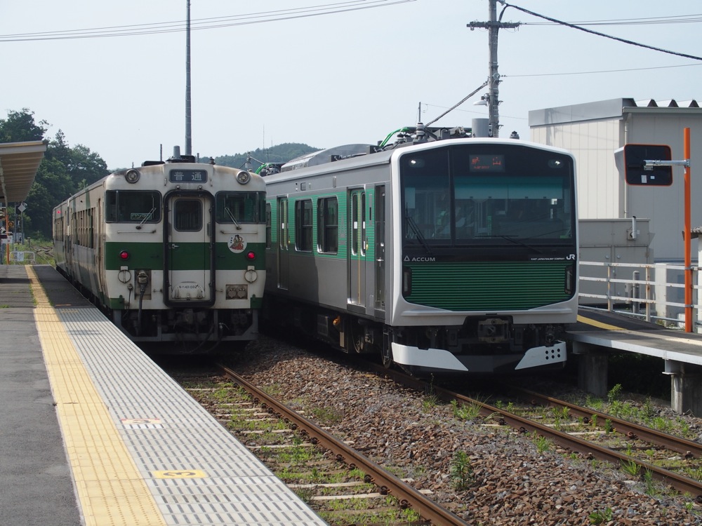…暫くして、遠くから電車風の車両がやってきましたが、パンタグラフは畳んでありますし、何よりここは非電化区間であるというのが、見た目的に不思議な感じを醸し出しています。今まで乗ってきたキハ40形のようなエンジン音はせず、時折モーターの音が聞こえるので、やはり電車という括りになるのでしょうが、これが蓄電池駆動電車の特徴という事なのでしょう。車内は最近のJR東日本の車両という感じで、両開き、3扉車である事から、都心を走っていても差し支え無さそうな雰囲気でした。また、車内灯は LED 化されており、正に最新鋭の技術を持って生まれた車両であるとも言えるでしょう。また、駅を発車する時に発車メロディが流れてきたのですが、これは車両側に設置されているもので、成程、無人駅等を走るローカル線ならではの対策がされている車両なのだとも思いました。