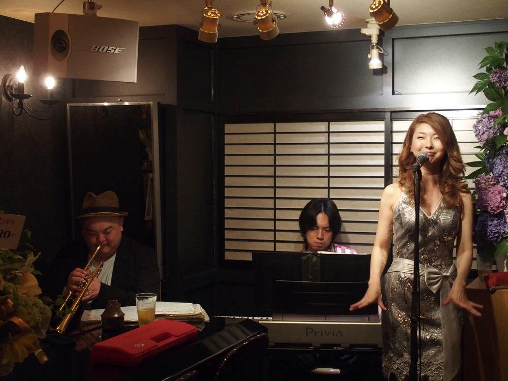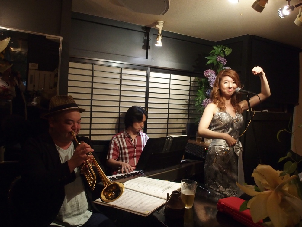 そして7月7日の七夕の日には、こちらも神泉時代からの共演者である、ボーカルの山崎信子さんと、今回2回目の出演となるトランペットの織田君でやっていきました。こちらも初組み合わせの状態でしたが、トランペットらしい曲を選んで進めていった事もあり、お客さん達にも大好評で迎えられていたのが印象的でした。