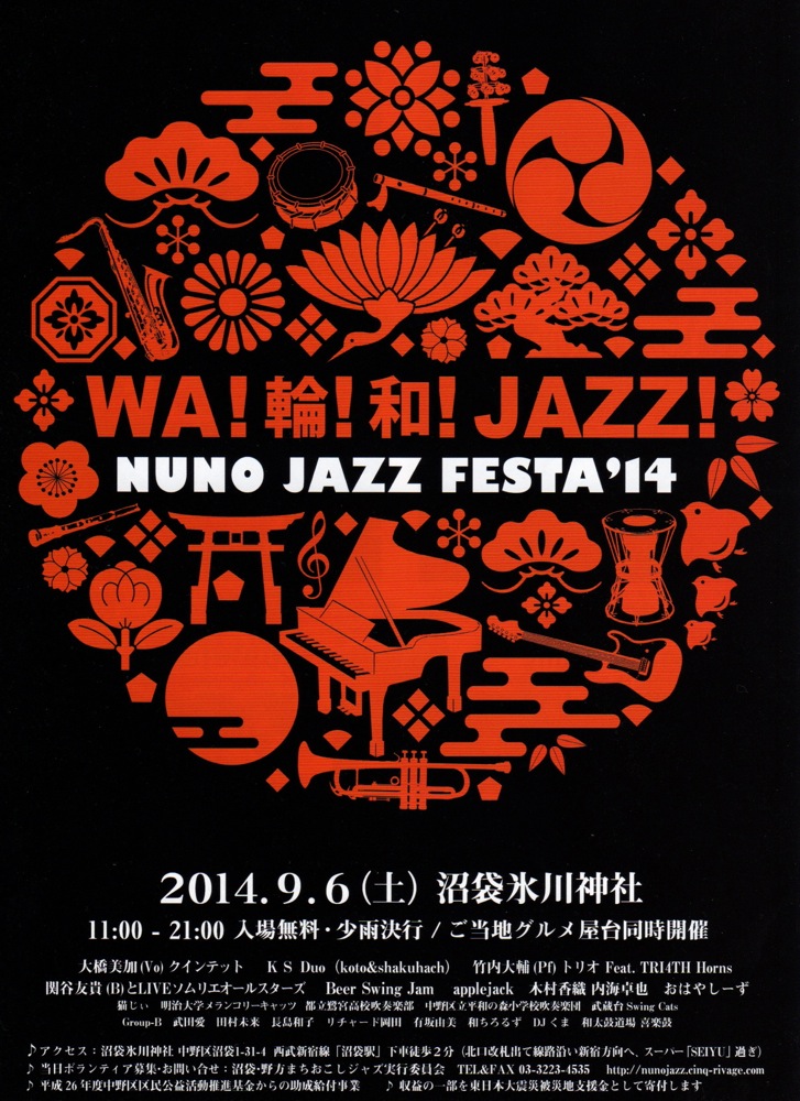 早速ですが、この期間中に決定したライブが幾つかあります。まずは、9月6日(土)に沼袋で行われる『NUNO JAZZ FESTA 2014』への出演で、自分は2バンドでの出演、しかもその内の1つは、自分がリーダーを務める竹内大輔ピアノトリオに、TRI4TH のホーン隊2人を加えたクインテット編成で行う“竹内大輔トリオ Feat. TRI4TH HORNS”というもので、本当にこの日限りのスペシャル編成でのライブとなります。そしてもう1つは、ベースの関谷君がリーダーを務める“関谷友貴と LIVE ソムリエオールスターズ”への出演というもので、こちらもこの日限りのバンド編成となります!…そして、翌日の9月7日(日)は、竹内大輔トリオとして、お馴染みの吉祥寺 Sometime への出演と、土日で盛り沢山の2日間となりそうです♪…いずれも気合いが入ったライブですので、是非とも見逃さないように(笑)、よろしくお願いします!