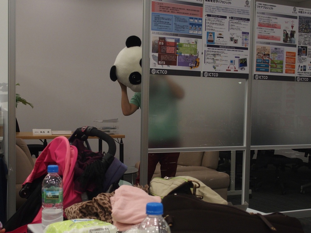 自分達の出番は19:10〜で、既に夕暮れ時であり、少し風が出てきて空気も冷んやりとしていた状況ではありました。飲食店ブースも多数出店されていたのですが、自分が到着した頃には既にピーク時は過ぎた感じだったでしょうか…。しかし、自分達のステージには多くのお客さんに残って頂けたようで、盛り上がりそうな気配は感じでおりました。自分達も、控え室にてパンダの被り物を着けて遊ぶ等、モチベーションを上げてステージに臨んだものでした。