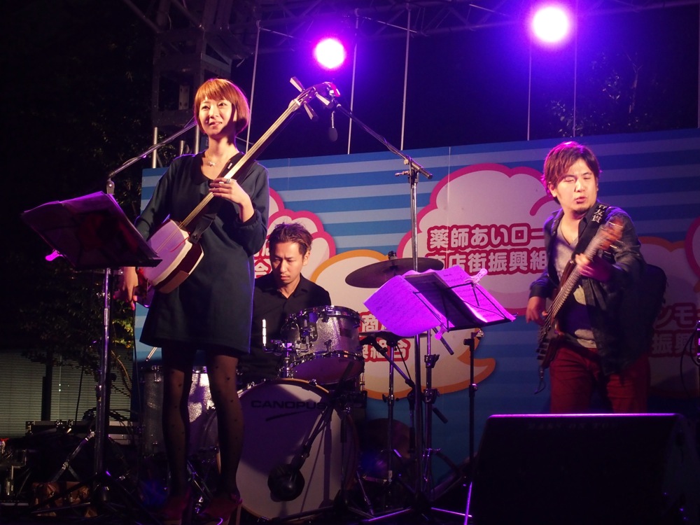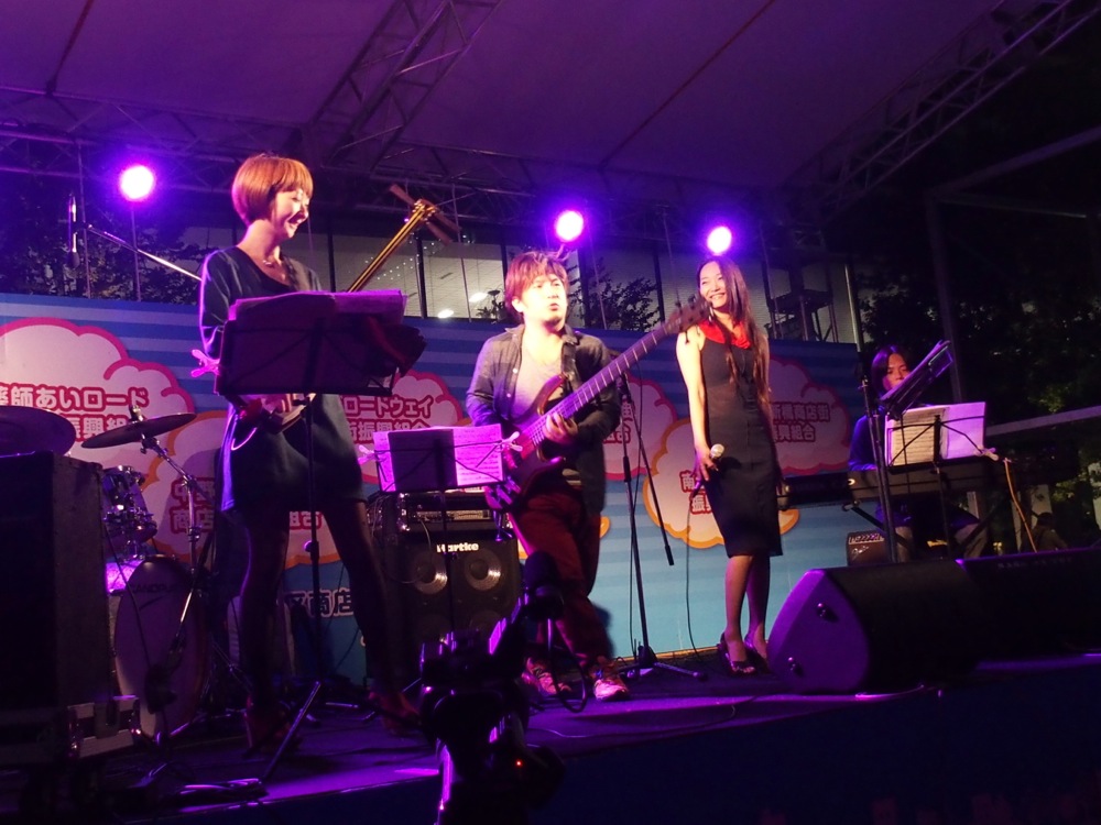 ライブの選曲は、1st.CD『CROSSOVER』から半分、最近取り上げ始めた曲から半分…というような感じの構成にしていきました。今回の演奏場所は黒船にとって、初の野外でのライブであり、そして初の、不特定多数の方々に向けたライブでもありました。恐らくは殆どの方からすると、なかなか聞き慣れない音楽に戸惑いもあったのではないかと思いますが(笑)、ライブ後には多くの方にCDを御購入頂け、自分達ならではの何かしらの魅力は伝えられたのではないかと思います。ベースの関谷君もステージを飛び出し(右上写真参照)、懸命にバンドアピールを図っておりました(笑)。