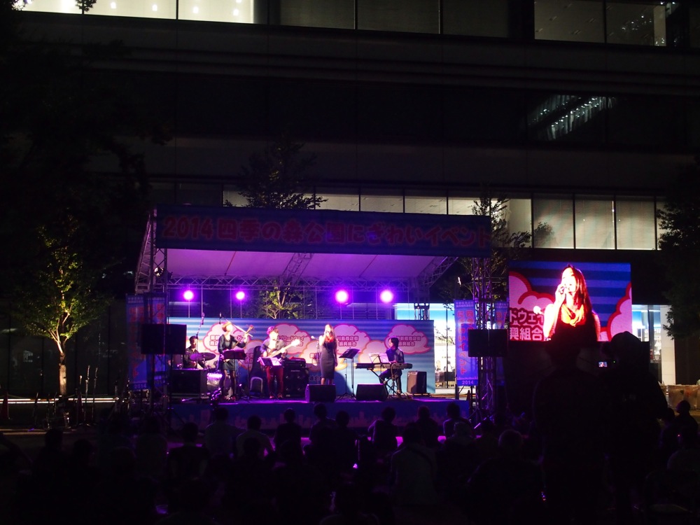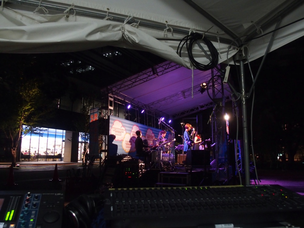 中野四季の森公園は広く、客席スペースに座席等は置かれていなかったので、お客さんの多くは地べたに座って見て頂く形になっていました。お客さん的には大変だったかもしれませんが、皆が地べたに座っているという環境もまた音楽フェスティバルらしさを出しており、個人的には少しテンションが上がったのを憶えています(笑)。ステージ横には大きなディスプレイも備え付けられており、遠くからでも見える配慮もなされていました(また、ステージのネット配信も行っていました)。自分達に与えられたステージ時間は約50分で、凝縮して黒船の魅力を引き出していきたいものでした。