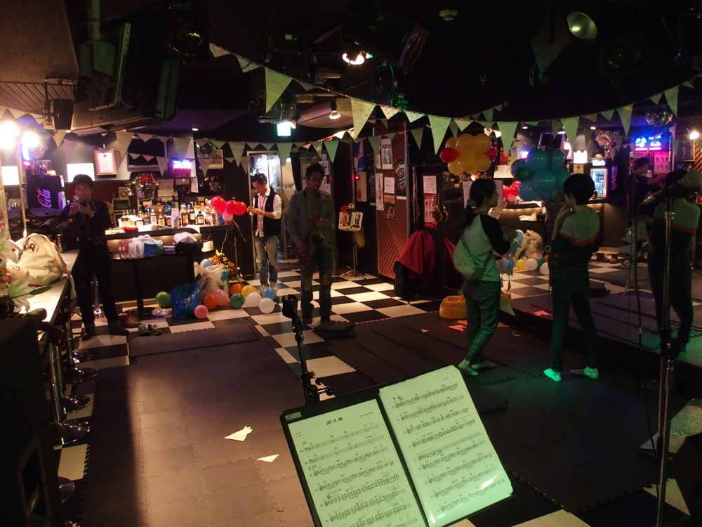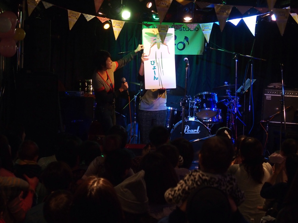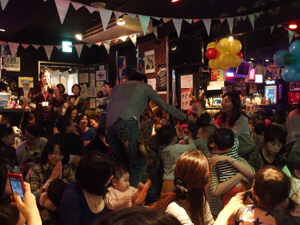 そこで今回は、クラウドファンディングという手法を取りました。ライブハウスは借りれたものの、客席フロアは机や椅子を取っ払い、クッションマットを敷き詰めて、地べたに座って楽しめるよう配慮しました。確かに、椅子に座って赤ちゃんを抱っこさせたままライブを楽しむ…というのは難しいかもしれません。そして、ベビー用のハイチェアをレンタルしたりと、これは、ライブハウスの協力もあっての事だと思いますが、そういったものが置けるスペースも、快く提供させて頂いたのでした。クラウドファンディングでは、惜しくも目標金額には届かなかったものの、このプロジェクトを通して意志を伝える事が出来たという部分もあり、何とか今回の実現に至ったのでした。…当日、会場は50組近いママと赤ちゃんで満席状態!…多くの方が興味を持って頂けているのは事実のようです。会場は、ライブハウスならではの雰囲気を、手作りの装飾で mama JAZZ らしい空間にアレンジし、皆に楽しんで頂ける配慮が細かに感じられました。そして、いよいよ演奏の始まりです。