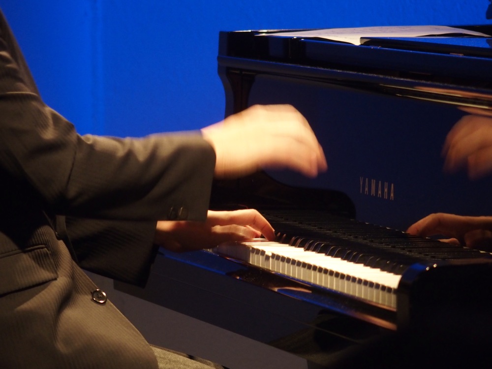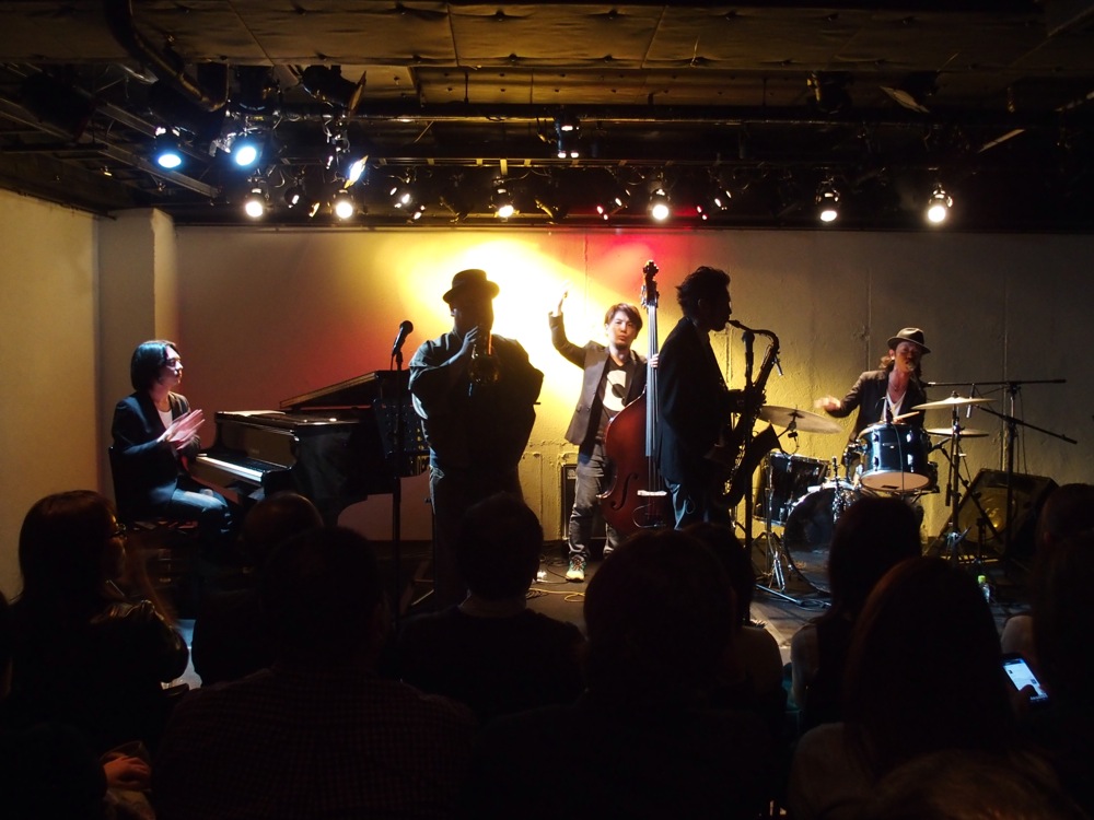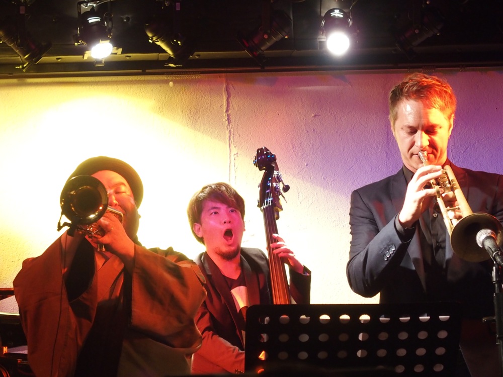 そして、今度は Five CornersQuintet の曲から“Shake It”を演奏しました。この曲は今回初めて演奏した曲でしたが、何とも耳に残る雰囲気を持った曲で、この曲を一緒に演奏出来るというのも、有り難いと思わなくてはならないですよね…。そのまま今度は、トランペットの織田君と Jukka でフリーの掛け合いが始まり、自分達でアレンジをした“Moanin'”へと突入させます。ここでの曲のテーマを1フレーズずつ、2人で分け合って弾くというのは Jukka のアイデアで、緊張感の掛け合いから、緩和の掛け合いへと見せ方が変わり、とても引き込まれる構成になっていたのではないかと思います。勿論、ソロの研ぎ澄まされたフレーズも凄いの一言です!