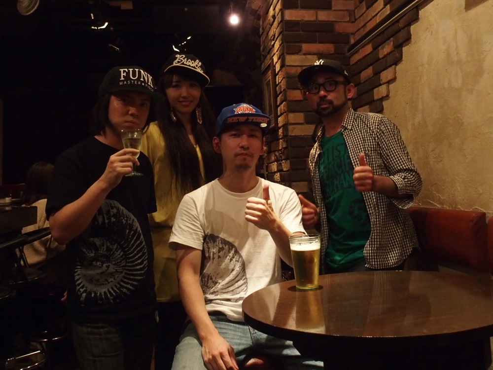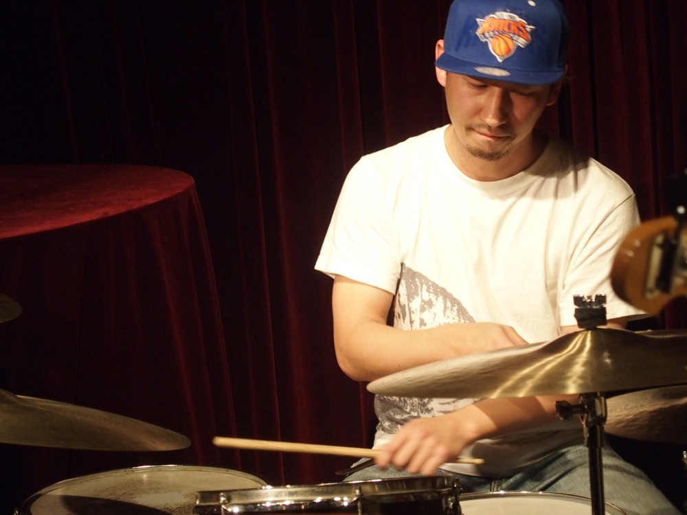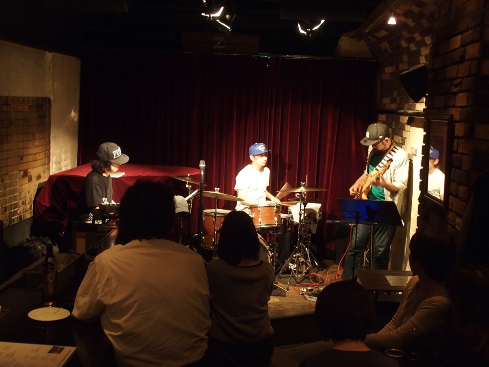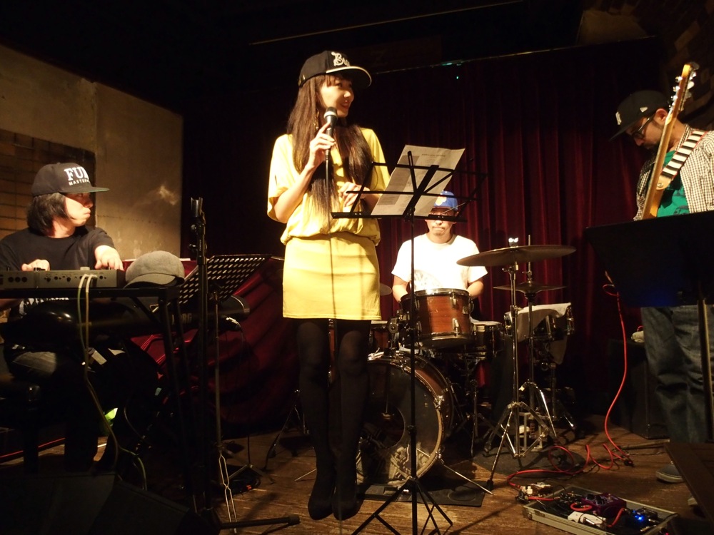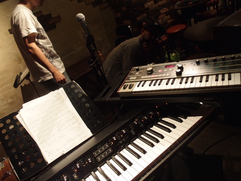 それは、出演メンバー全員でキャップを被ってステージに上がり(右上写真参照)…ではなく(間違いでは無いですが…笑)、アナログシンセを使ってステージに臨んだ事でした。アナログシンセサイザーは、左上写真の右上に写っているキーボードですが、トシさんにこれをお借りしまして、既存のエレピと併用して演奏していったのでした。