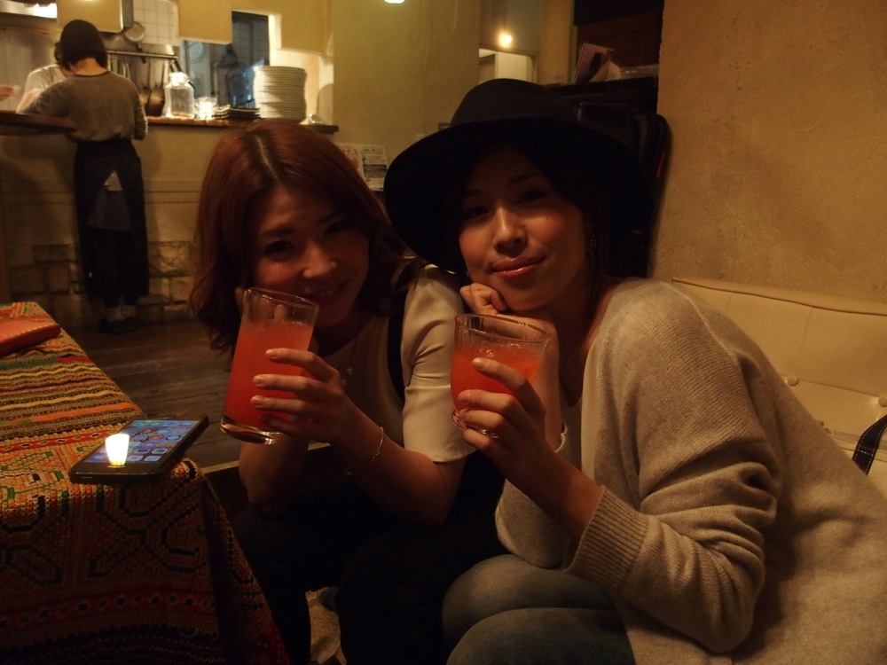 新年会ライブらしく、この日ならではの工夫があちらこちらに見えました。まず、お客さんには軽い料理が出されるのですが、愛さんの故郷である福岡から、がめ煮(筑前煮)が提供されました。材料をお店に渡して、ここで作って貰ったのだそうです。また、彬子さんからの提供物として、オリジナルカクテル(右上写真参照)の販売もありました。オリジナル曲の名に因んだ、“愛を愛を愛を”という名前が付けられていましたが、いつもと違って?味を気にしながら作ったそうです(笑)。注文する方も多かったように思いました。