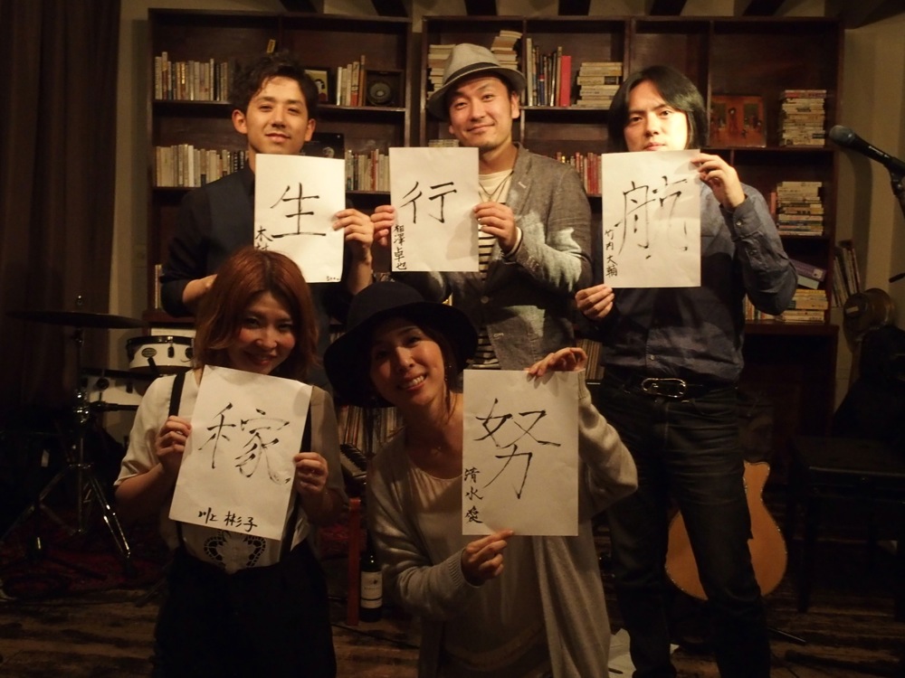 中にはジャンケンコーナー(勝ち抜くと、彬子さんと愛さんがデザインしたTシャツが貰えるというものでした)や、お客さんへのサプライズ・バースデー祝い等もありましたが、この時期ならではというのは、やはり『今年の目標を漢字1字で』というコーナーでしょう。これは演奏メンバー全員に課せられたものであり、事前に言われていたものではありましたが、なかなか考えさせられる一幕でした。それぞれの字は右下写真のものになります。ここでは詳しくは説明しないので、色々と想像を膨らませて下さいませ♪