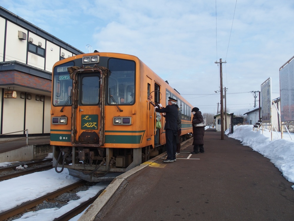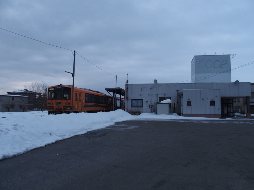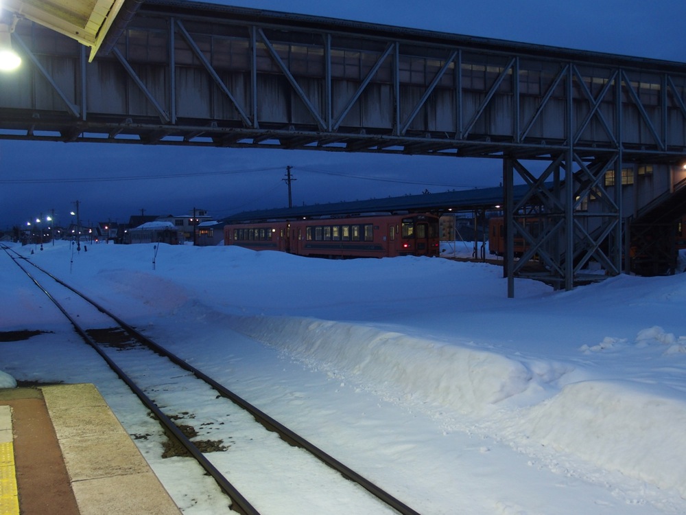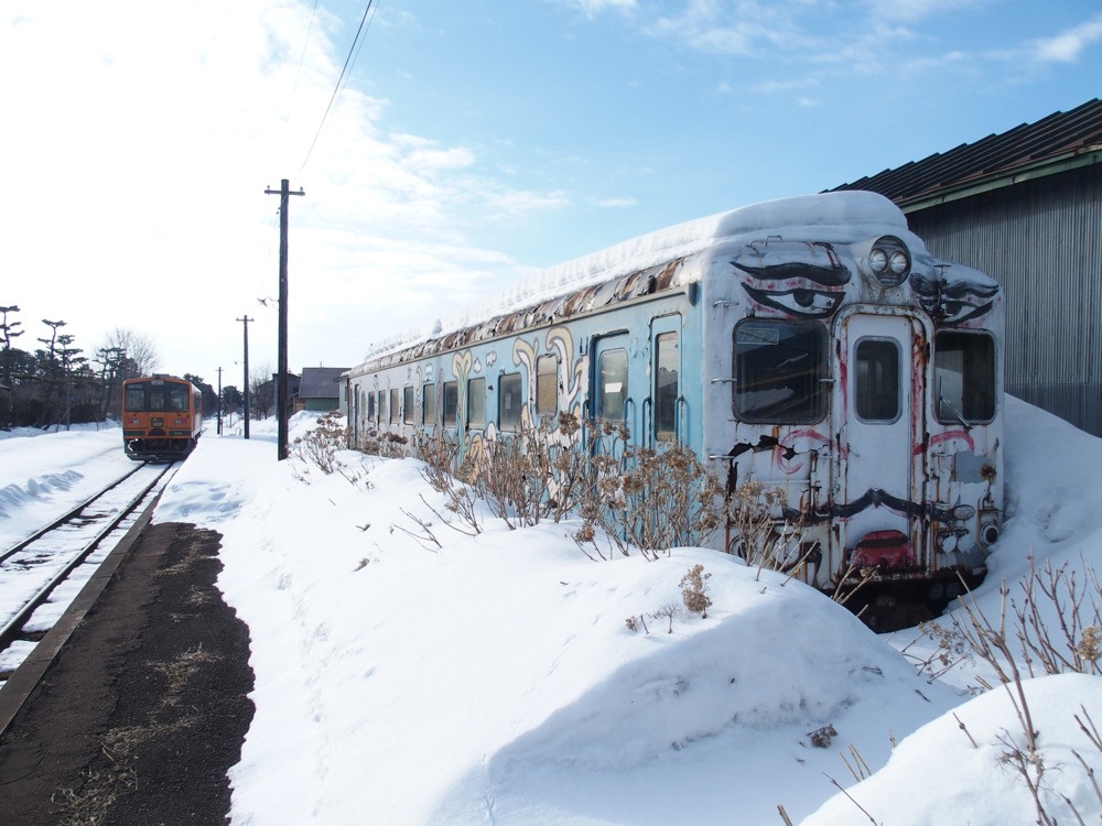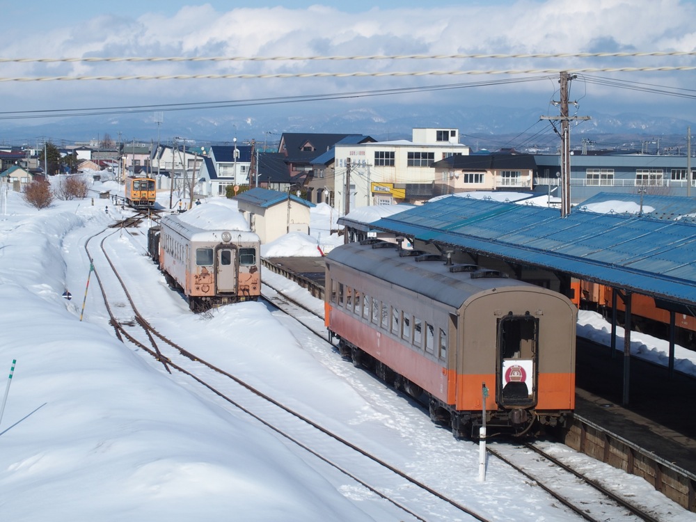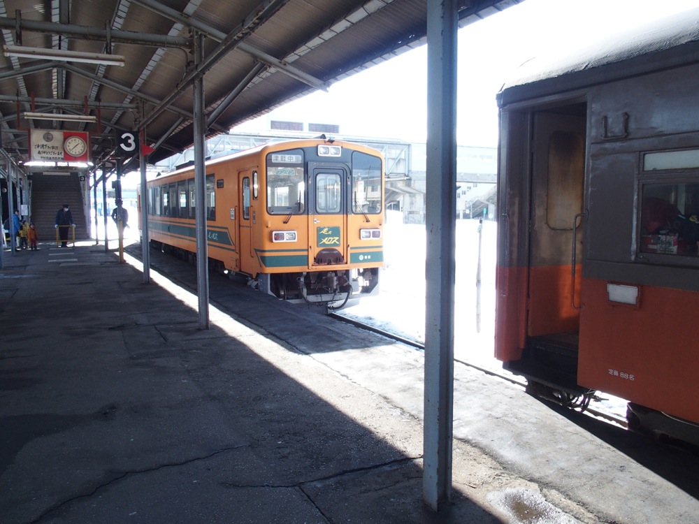 さて、列車に乗って次の十川駅までやってくると、もう起点の津軽五所川原駅まではあと1駅という状態になってしまいました。もう鉄道さんぽも終わりが近付いてきたわけですが、前述の「ストーブ列車」を満喫させるべく、当駅で下車してから、再度津軽中里駅行きの列車に乗って金木駅まで戻り、ここでまた折り返して再度津軽五所川原駅に向かうという手筈を取りました。やはり旧型車両を使用するストーブ列車は体験しておかなくてはなりません。もう60年以上も使われている車両なので、いつ無くなってもおかしくないのですから…。