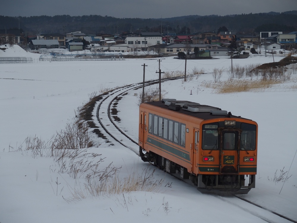 さて、1駅進んで、深郷田という駅で降ります。「ふこうだ」…と読む、変わった駅名なのですが、ここから更に1駅先の大沢内駅まで“さんぽ”してみましょう。まだ時刻は朝の7:20ぐらいであり、こんなに朝早くから駅を降りて“さんぽ”するのも珍しいのですが(笑)、津軽半島らしい荒涼とした雪景色と、活気ある列車内の雰囲気とは対照的な静かな街並みを歩くのは、東京に住んでいては滅多に体験出来ない事でもあるので楽しいです。まあ、この駅間では国道が津軽鉄道をオーバークロスする区間があり、そこからの撮影がメインではあるのですが…(笑)。