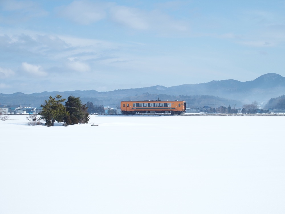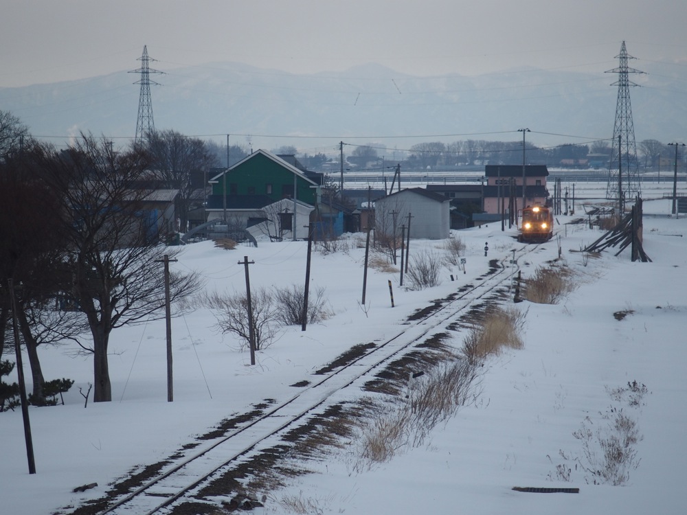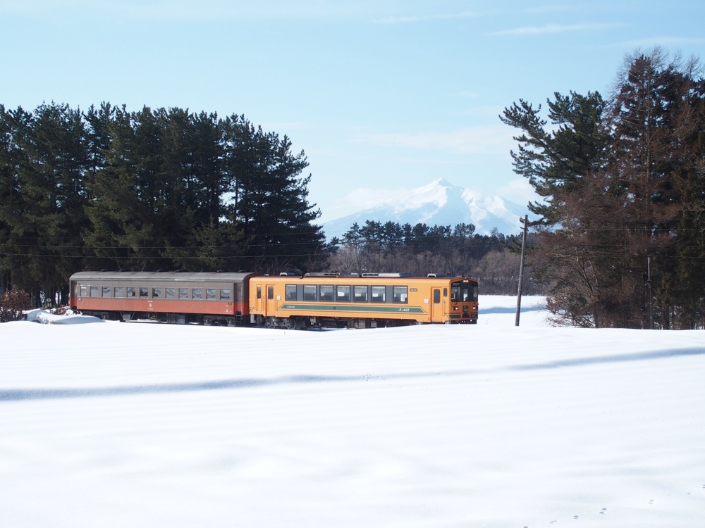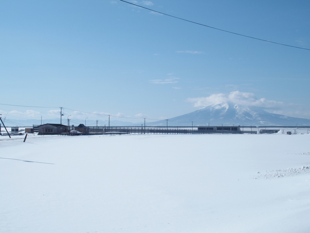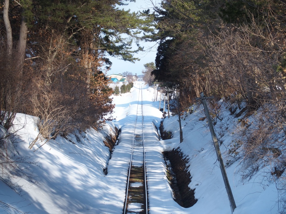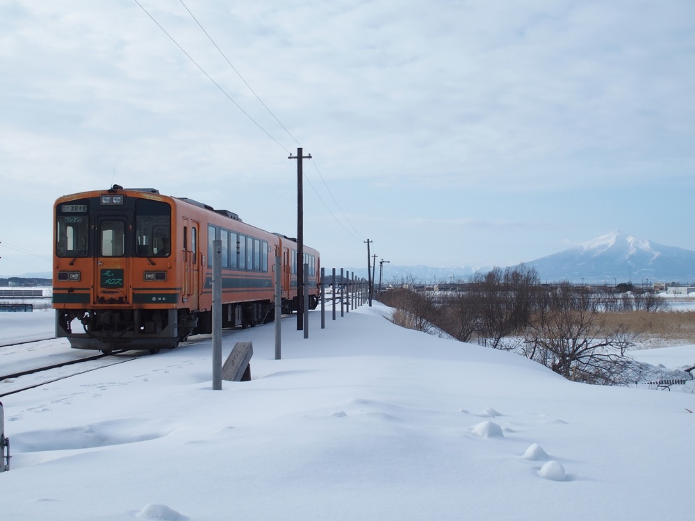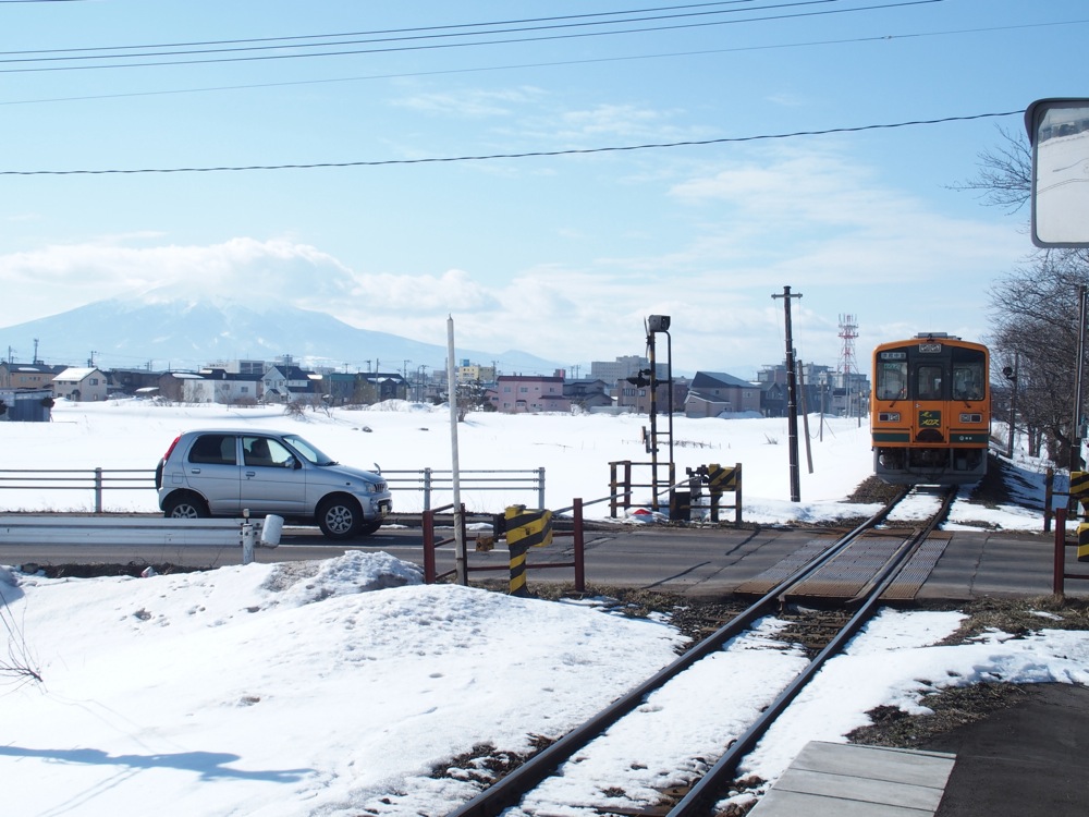 これらの駅間は1kmとなっていますが、歩いていくと多少大回りになるのと、今の時期は積雪で通れない道もあったりしたので、道のり的にはなかなかの距離になっていた事でしょう。周囲は開けていて、正に一面銀世界という感じでしたが、その向こうには相変わらず綺麗な岩木山も望めたりと、正に天候に恵まれた1日だと改めて思いましたね。