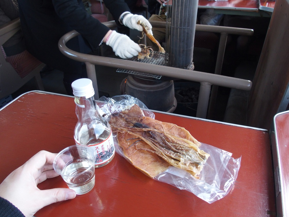 そして車内ではスルメや日本酒等の販売もあり、早速購入して楽しみます。勿論、スルメは前述のダルマストーブで炙ってくれます。どちらもオリジナル商品で、よく見ると日本酒の名前は「ストーブ酒」。ラベルにはストーブ列車と踏切の写真が掲載されており、踏切注意が“飲み過ぎ注意”になっていました(笑)。それにしても、この旧型車両の持つ、独特の温もり…とでも言うのでしょうか。本当に落ち着きます。これが本来の汽車旅なのではないかと思って旅情に耽ってしまうのは、日本酒を飲んでいたせいかもしれませんが…。