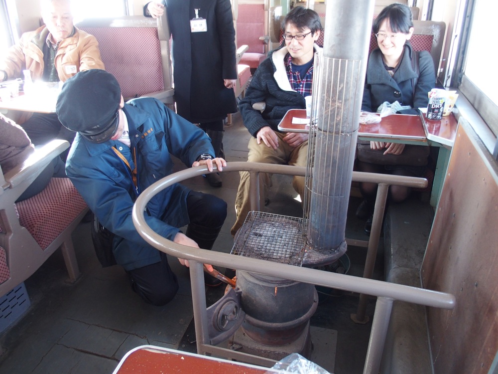車掌さんによって石炭が焼べられ、更にその温かさが増してきます。…というか、ストーブが目の前に位置する席に座った為か、むしろ暑過ぎるぐらいだったかもしれません。本来ならば、外は吹雪の中での有り難みというのを感じたりするのでしょうが、この日は幸か不幸か絶好の天気だったので(笑)、日差しの強さも相まって、汗が滲んでくるような状態でもありました。