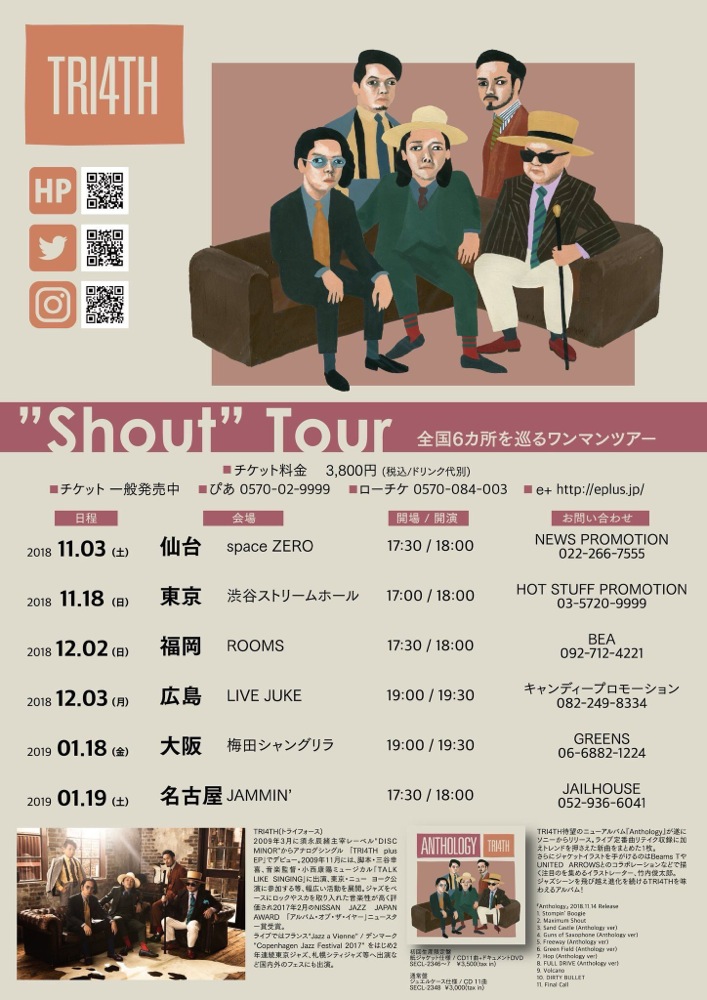 メジャーデビューを発表して一番の大きな変化というと、衣装と思われた方が多かったのではないでしょうか。確かにそれまでは黒のスーツで白ネクタイ、1人は和装というスタイルを長い期間貫いてきたので、突然の変化に驚かれたかもしれません。自分達にとっても挑戦でありまして、新しい世界に向けての意思表示でもありました。今までに比べ、自分達を更に広く、多くの世に送り出そうとして頂ける方が沢山いらっしゃって、自分達だけでは到底思い浮かばなかったアイデアを幾つも提案してくれて、本当に、こんな機会は2度と無いかもしれません。自分達に出来る事は、1つ1つ真摯に対応し、TRI4TH の方向性と改めて向き合う事です。その1つの答えが、11月に SME レコーズからリリースさせて頂いたCD『ANTHOLOGY』であり、今回の『Shout』ツアーでもあるのです。どのライブ会場でも満員御礼のお客さんに温かく迎えられ、自分達の進むべき道は間違ってなかったと確信出来ました。