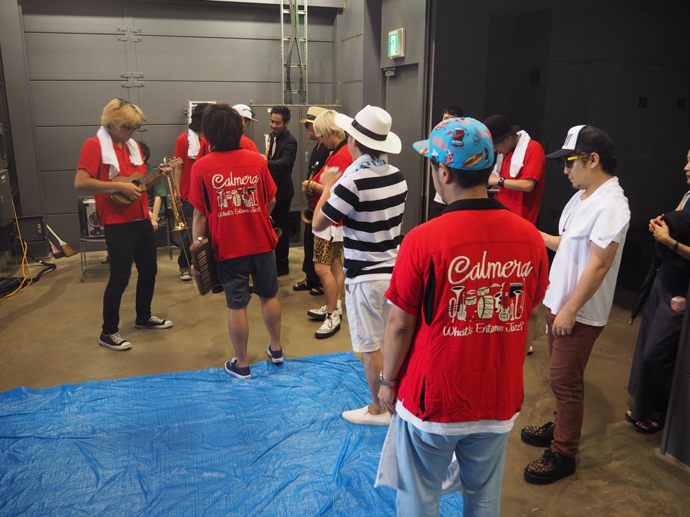 ここでカルメラ一行と合流し、サウンドチェックへと進みました。それぞれのバンドの準備は勿論ですが、ここではコラボの為に、コラボリハーサル、サウンドチェックも行わなければなりません。カルメラと TRI4TH の総勢13名がステージに上がるのは、何度見ても圧巻の一言ですが、進行は和気藹々とやっていけるのも、盟友と呼べるバンドだからこそかもしれません。楽しくサウンドチェックも終了…。いよいよ本番に向けての準備が整いました!