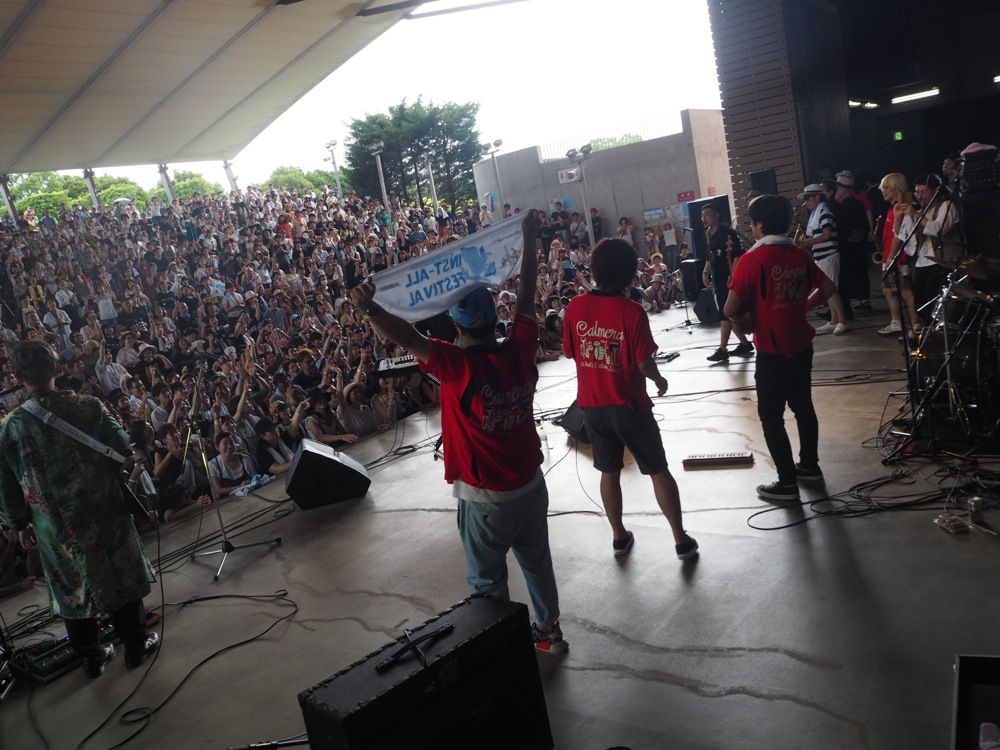 今回の自分達の出番は3バンド目、時間は13:30〜でした。自分達の前には The Hey Song、そしてお馴染みの Calmera が会場を熱く盛り上げており、自分達もそれに続けと言わんばかりに皆で新グッズであるサングラスを身に付けて(笑)出番を待ちます。この日は気温的にも本当に蒸し暑い1日となりましたが、そこにも負けない熱気が会場には既に表れていました。