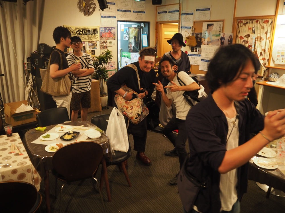 関谷家にてゆっくり休む事ができ、心斎橋 JANUS へと向かいます。JANUS は自分達は初出演となりましたが、今までやってきた大阪のライブハウスの中でも大きく、そして、いつもより豪華な雰囲気が漂うお店でもありました。勿論、JANUS に行く前には、サックスの藤田君が大好きなタコ焼きも購入済み…。心身共にモチベーションも高く、お店に入る事が出来たと思います。