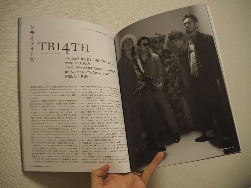 今回、TRI4TH としては随分と色々なメディアで取材を受けさせて頂き、前作以上に宣伝広告の機会、そしてそのバリエーションも増えたと思いますが、この『JaZZ JAPAN』ではあくまでジャズという分野から見た取材が特徴とも言えます。勿論、それは当たり前と言えば当たり前なのですが、『jack-in-the-box』では音楽のジャンルを超えた分野からの取材・アプローチが多かったので、こうして『JaZZ JAPAN』の取材を受けるにあたって、改めて自分達がジャズバンドである事に、今まで以上に身を引き締めて取り掛からないといけないとも思ったものでした。