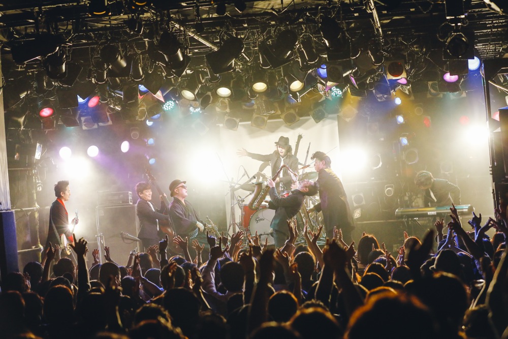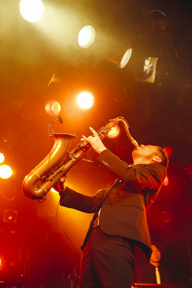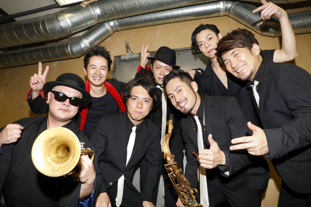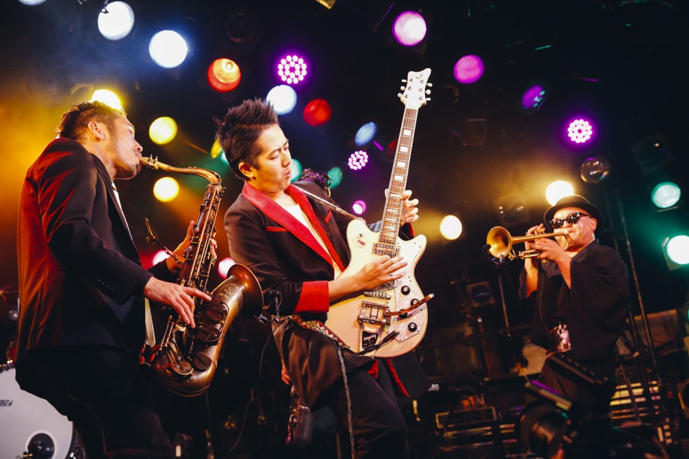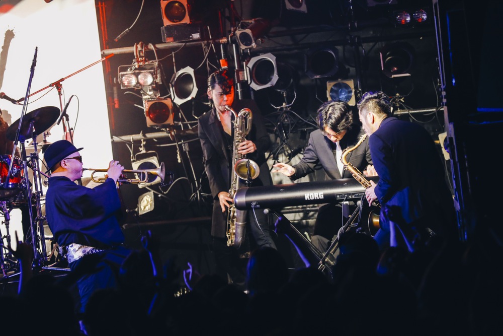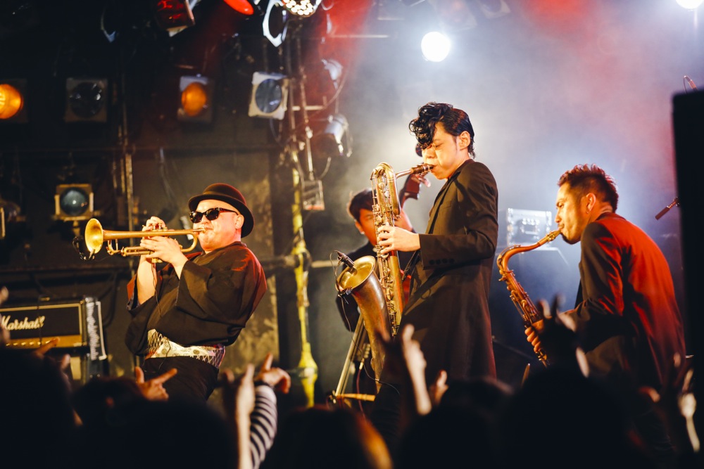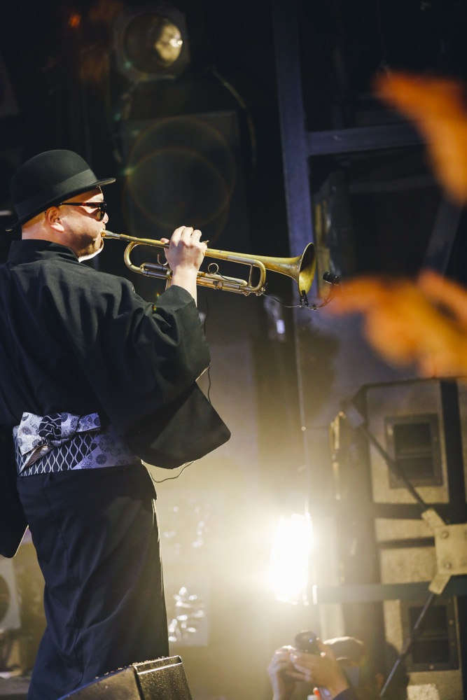 変化があったのは後半戦。前述のように、今回はカルメラも出演していたのですが、せっかくいるなら…という事で、コラボステージをお届けしようではありませんか。ホーンズのメンバーだけステージに上がって貰って、共に“HORNS RIOT”を演奏させて頂いたのでした。この登場には驚いた人達も多く、良いサプライズになったのではないでしょうか。分厚いホーンサウンドを大いに響かせていきました。