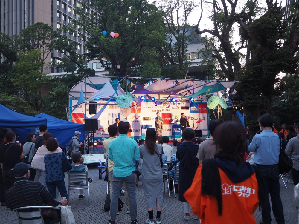 ステージは、中野四季の森公園の奥の角に設置されていました。…以前、黒船でこのイベントに出た事があったのですが〔黒船で『中野にぎわいフェスタ 2014』に出演!参照〕、あの時のステージの場所に比べると、だいぶ奥まった所に設置されている感じでした。しかも、近くの敷地ではエイサーのパフォーマンスをやっているようで、大太鼓の音が頻繁にこちらまで届いてきています。なんだか遠くに追いやられてしまったような印象でしたが、その分、ゆったりとした時間が流れてもいて、雰囲気は悪くはありませんでした。早速ビールでも頂き(笑)、前の方のステージを楽しみます。