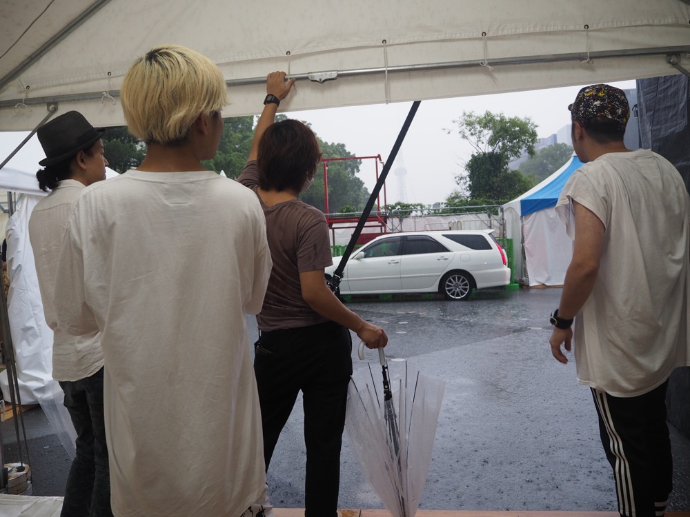 …この間は本当に大変でした。ステージ上に一応は屋根は設置されているのですが、この時の雨の強さは半端なものではなく、ステージ内までの吹き込みが凄くて、機材に沢山の水しぶきが飛んできてしまう程でした。このままでは機材が心配なので、一時的に楽器と共に別ブースへと避難。ステージからは機材が片付けられ、本当にここでライブが実現するのかというような状況になってしまいました。自分達の後に出演するカルメラと共に、心配になりながら時が経つのをしばし待ちました。