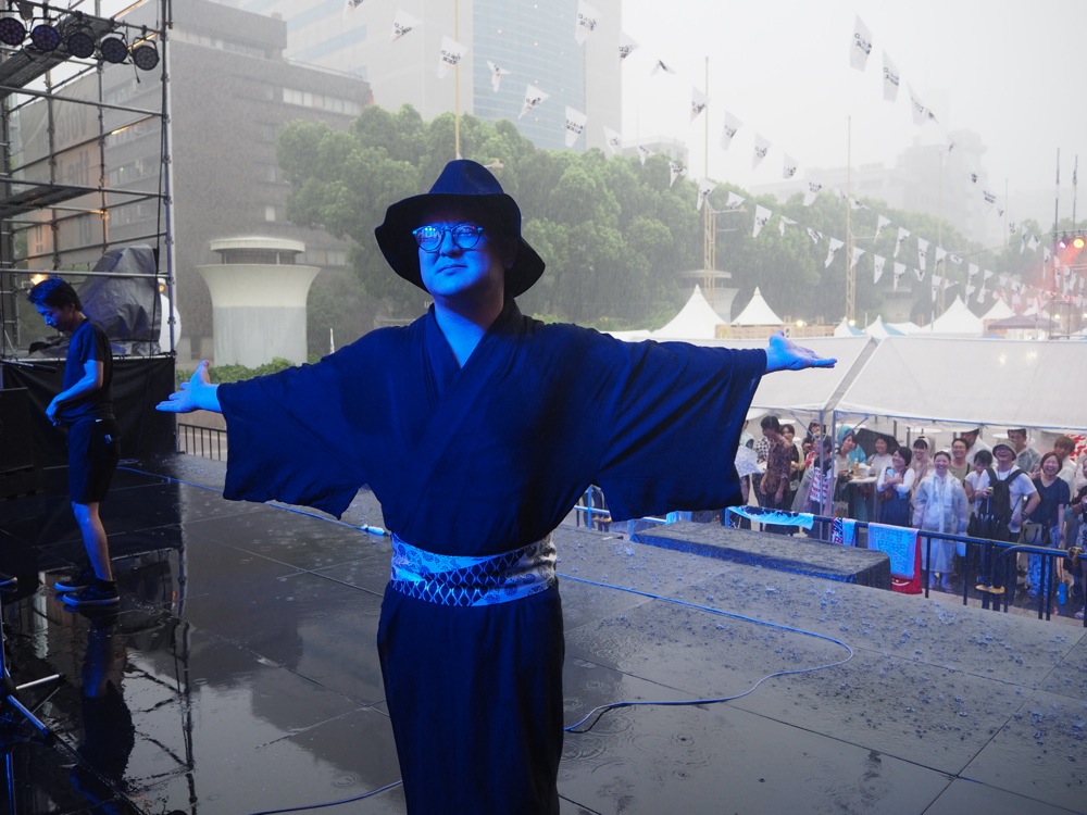 しかし、奇跡的に雨は上がりました。この時点で当初のライブスタートより、1時間程は遅い時間になってしまっていたのですが、自分達も急遽、短めのセットリストを制作させて頂いて、タイミングを見てライブを初めてさせて頂いたのでした。…この後はもう盛り上がりの連続で、 スタートまでしっかりと待って頂いた沢山のお客さんと共に、最高の時間を過ごさせて頂いたのでした。天候次第によっては、途中のセットリストも変えて進めていくつもりでしたが、最後の曲のタイミングの判断は間違っていませんでした。なんと、自分達のライブが終わった後に再び辺りは土砂降りに…。本当に奇跡的な時間になったと思いました。