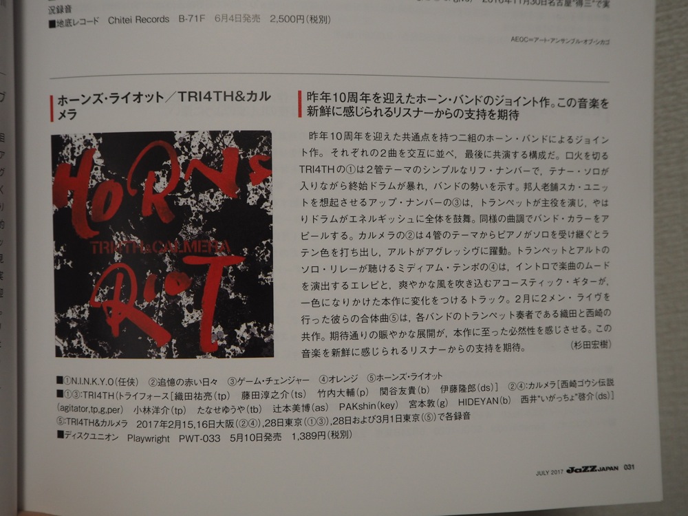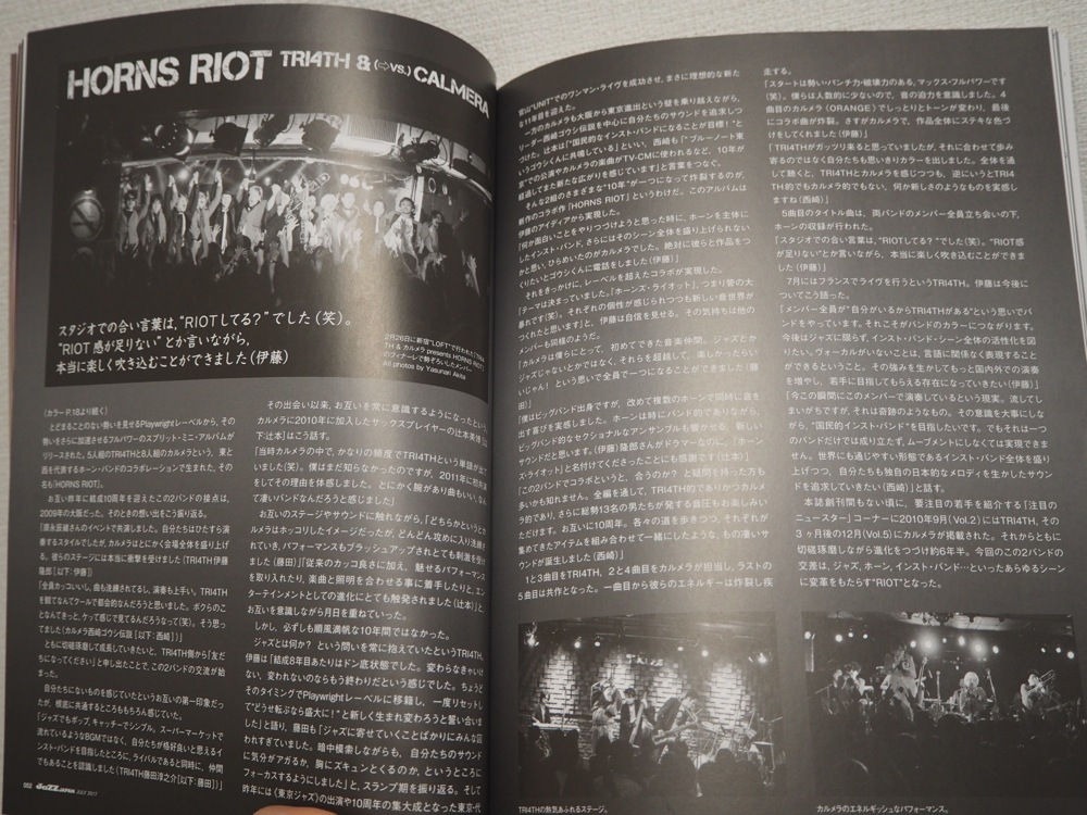 JaZZ JAPAN は創刊当初、老舗ジャズ雑誌とは異なるジャズ報道を目指していたようで(現在でも感じます)、いわゆるメインストリーム・シーンとは異なるバンドも数多く追っていたそうです。そんな中、“注目のニュースター”というコーナーに相次いで登場していたという TRI4TH とカルメラ。この2つのバンドがスプリット・アルバムを出し、そして改めて JaZZ JAPAN で大々的に取材されるというのは、何か大きな意味があるように思いました。改めて、特集ありがとうございました!