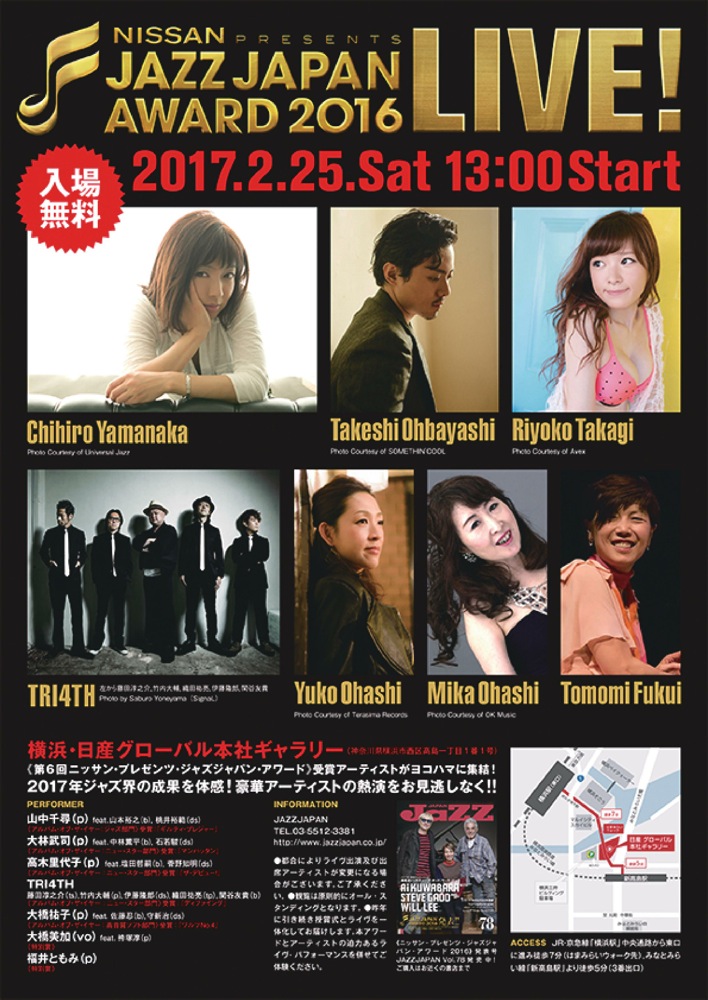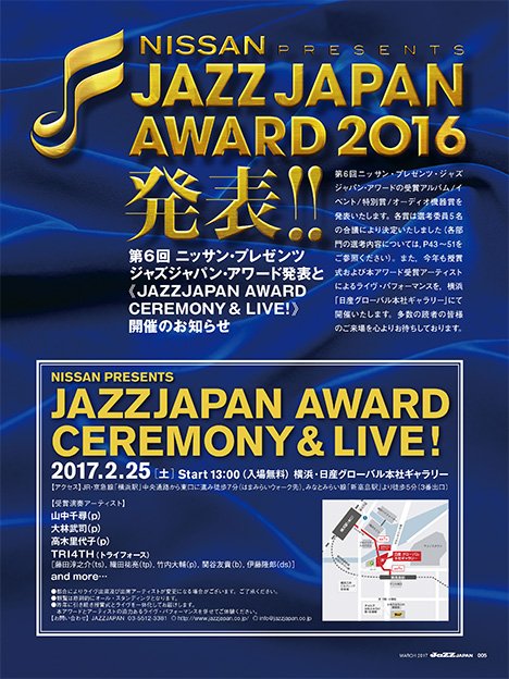 …さて、この「JAZZ JAPAN AWARD 2016」では、授賞式&受賞演奏ライブが予定されています。日にちは2月25日(土)で、横浜の日産自動車グローバル本社ギャラリーにて、13:00〜開演です。自分達の他にも、今回の受賞者による演奏が沢山あるとの事で、とても華やかな時間になりそうです。入場無料ですので、是非とも気軽にお越し下さい。自分達も、その貴重な場での演奏を楽しんでいきたいと思います。どうぞよろしくお願いします!