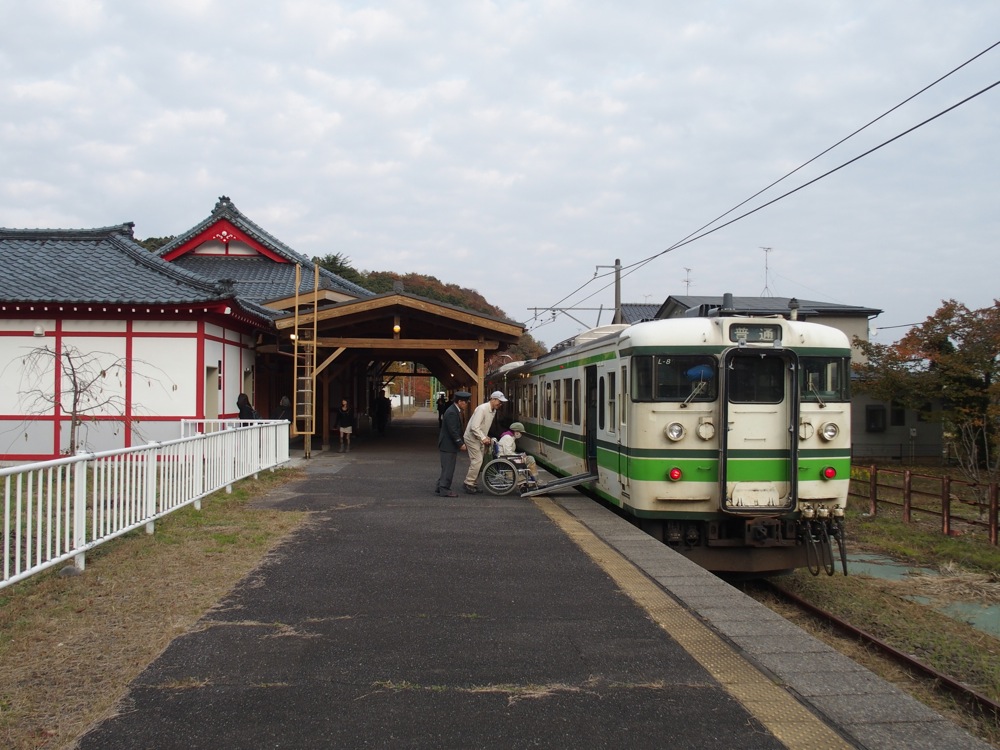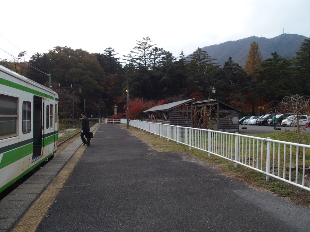 新潟の市街地を走り抜け、車窓はいつの間にか田園風景へと変わっていきます。走る車両も、旧国鉄型と言われる115系で、これは東京付近では見られなくなって久しい車両なので、少々ノスタルジックな気分にも浸っていけます。そして目的の弥彦駅へ到着。この日はどうやら弥彦の『菊まつり』が行われていたそうで、臨時列車も運行されているようでした。