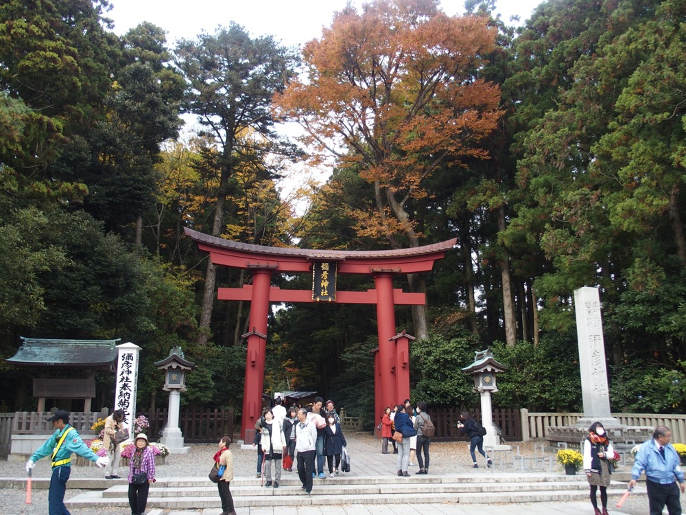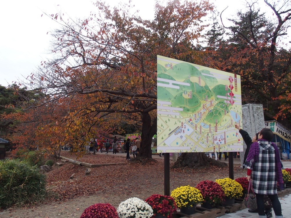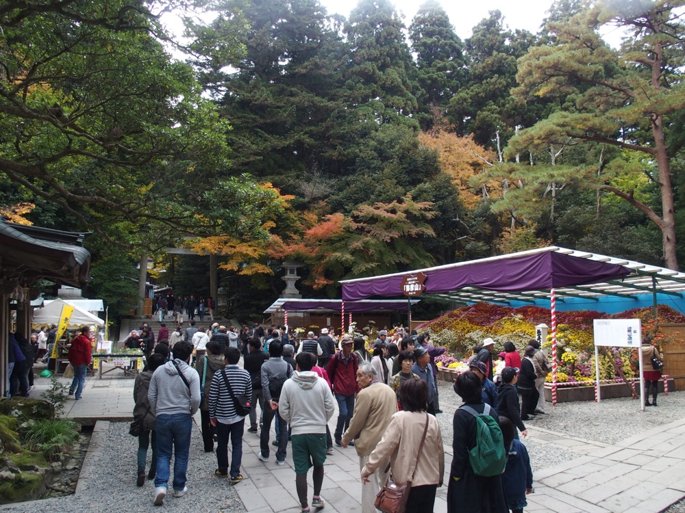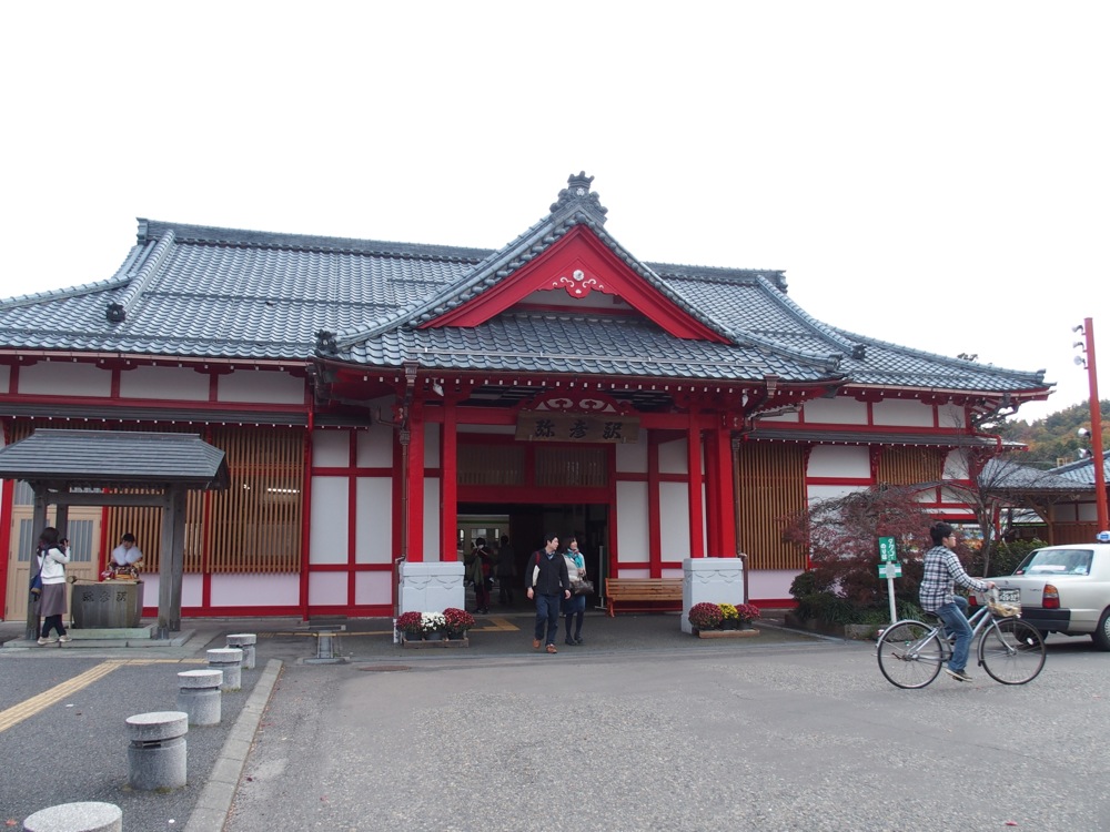 彌彦神社の本殿を模した駅舎である弥彦駅舎は、1916年開業当時のものらしく、早速圧倒されてしまいます。駅前は広場になっており、『菊まつり』の影響か賑やかな感じになっていました。そして、実はこの時点で気付いたのですが、周囲はちょうど紅葉が綺麗な時期ともなっていて、この人の多さはその為なのかもしれません。もう少し静寂なイメージが勝手にあったのですが、この日の気分としてはこれくらいの賑わいが嬉しい感じでもありました。