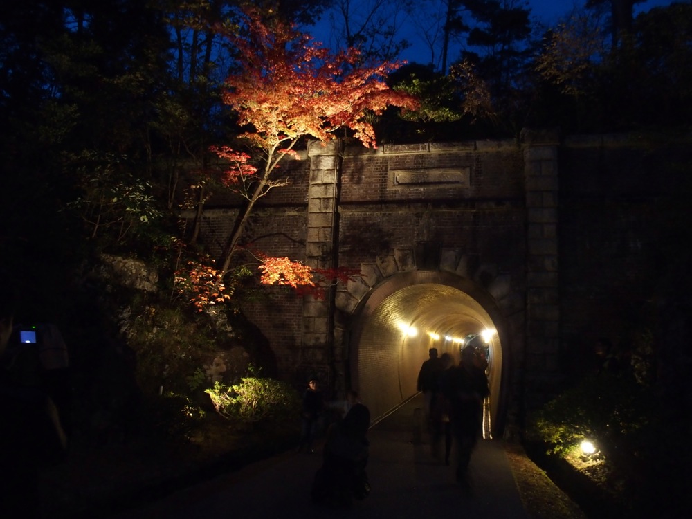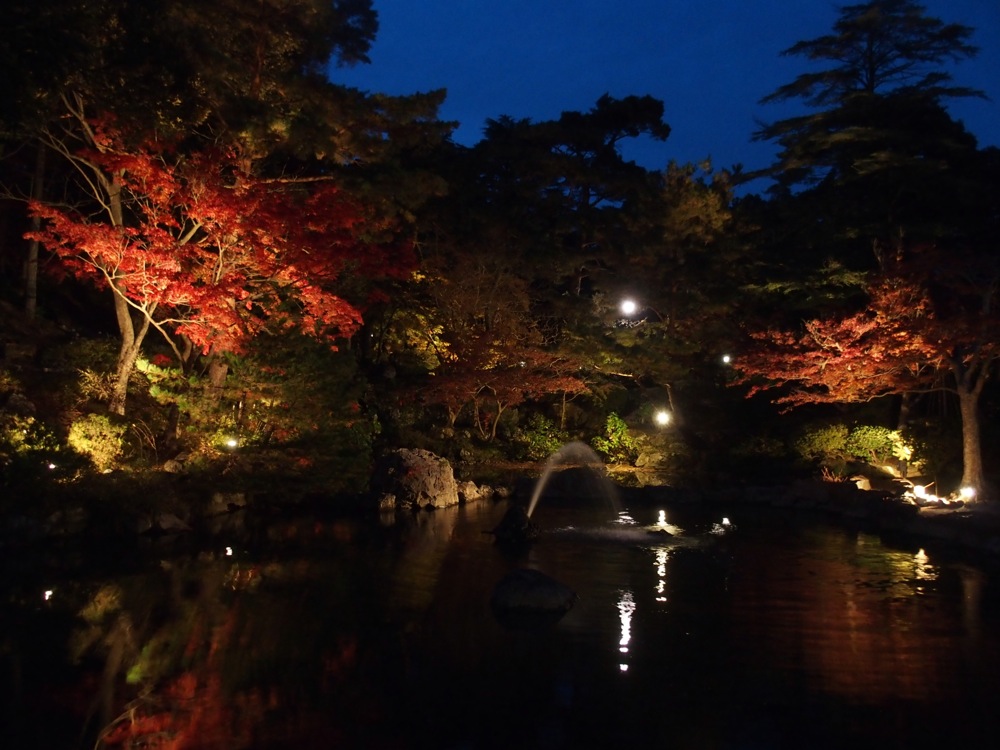 これらの景色を楽しんだ後は速やかに下山しましたが、流石に麓に着いた頃には、辺りは暗くなってきてしまいました。予定より少し遅くなってしまい、前打ち上げに間に合うか心配になりつつも弥彦駅に近付いてみると、付近で紅葉のライトアップがされているではありませんか!…何だかこの日は時間的にラッキーな事が続きます。電車が発車するまでの時間を見越して、こちらの景色も楽しみました。