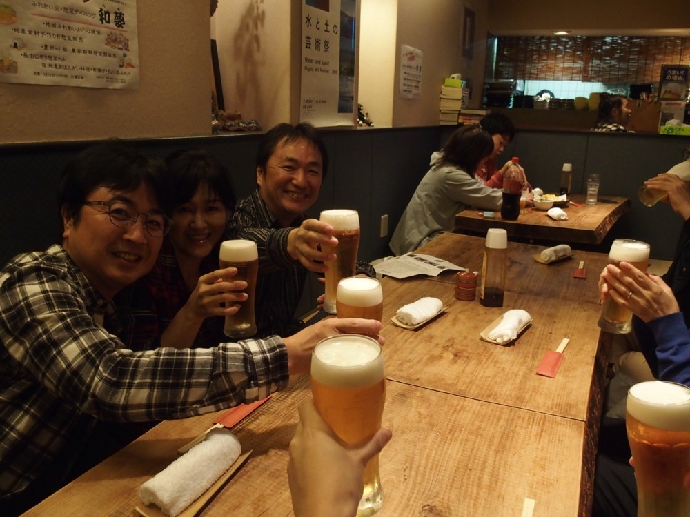 新潟市内に戻り、再度丸本さん達と合流。今回のライブを企画してくれた、丸本さんの奥さんのお兄さんにもお会いしまして、ライブの意気込みを共有させます。新潟と言えばやはり日本酒(写真はビールですが…笑)。料理と共に、美味しく頂けた夜になりました♪