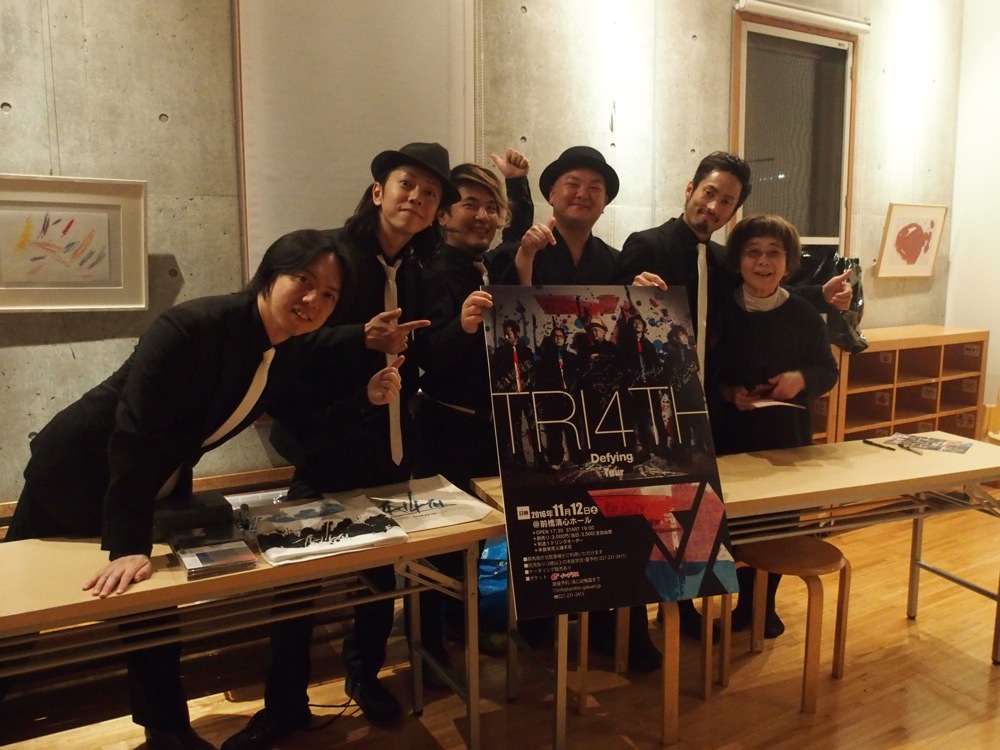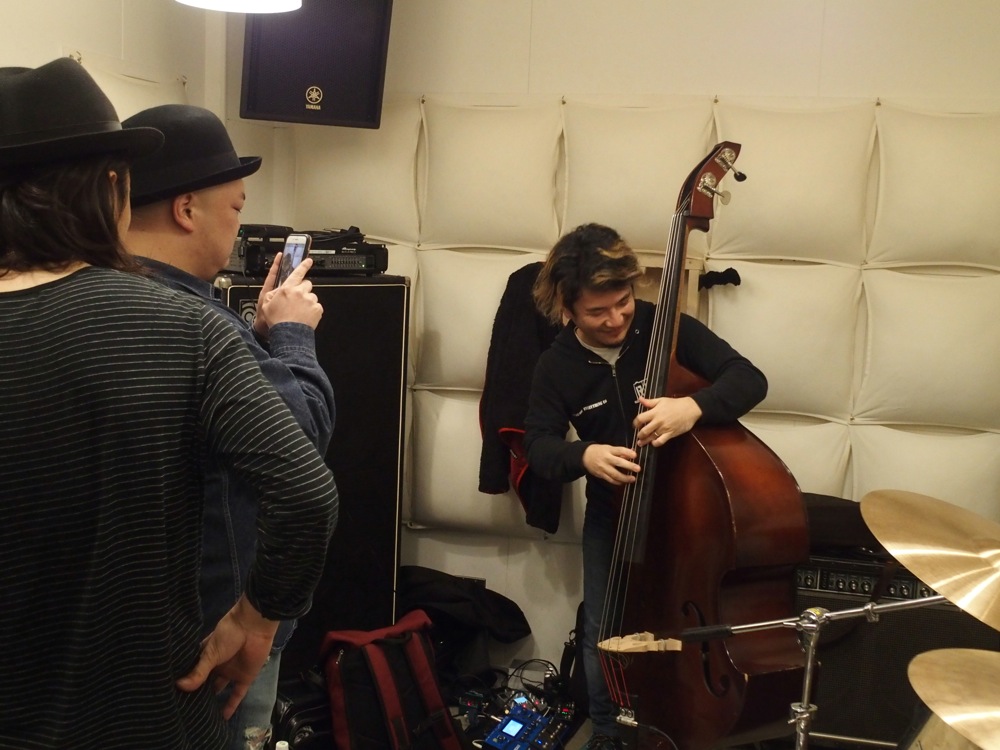 前日、11月11日は TRI4TH で東京でリハーサルを行っており、それを済ませた後に前橋へと移動を開始しました。この日はベースの日(1111でベースの4弦みたいなので…)という事で、関谷君のベース・パフォーマンスを見守りながら(左上写真参照)の幕開けとなった感じでしょうか。そのテンションは夜になっても高いままだったように思います。清心幼稚園に着いてスタッフの方々と挨拶をし、その日は前打ち上げという事で、ゆっくりと食事やお酒を楽しむ事が出来ました。