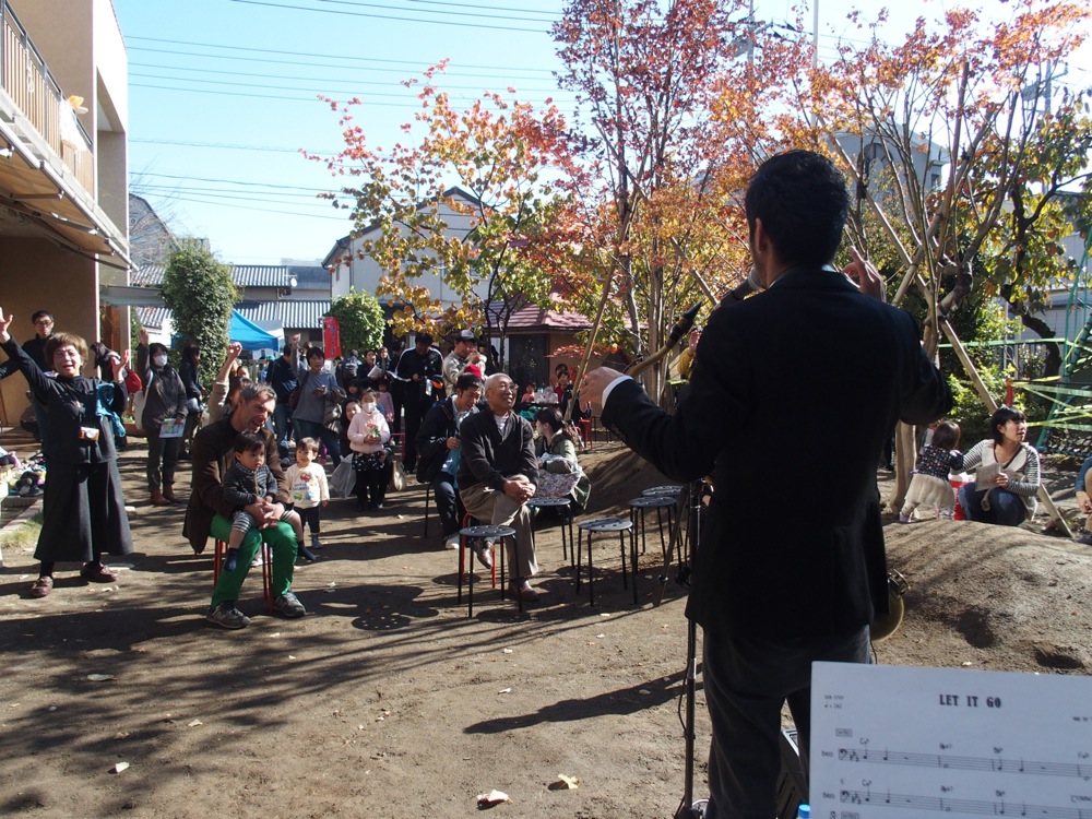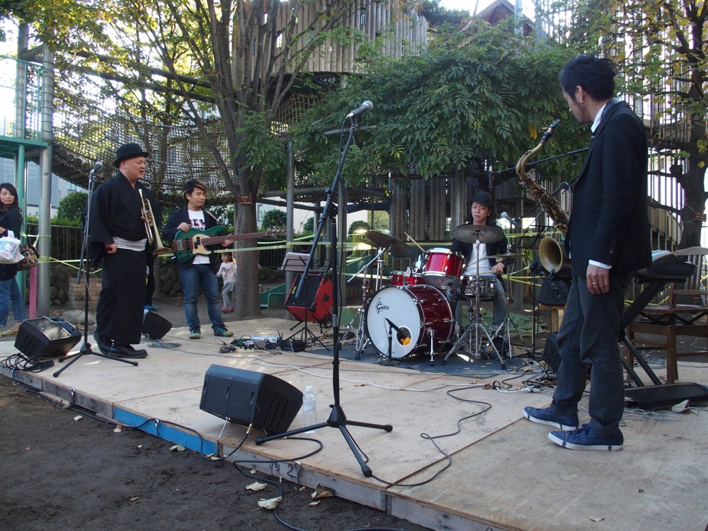 この日の朝昼に行われる清心フェスティバルは、清心幼稚園を中心として幾つかの箇所に色々なイベントスペースが設けられるようで、音楽やアート、ワークショップ等、多くの方に気軽に楽しんで貰えるような企画となっているようです。その中で TRI4TH はイベントの目玉として、朝と昼に1回ずつの『わらべ JAZZ』ライブを行う事になっていたのでした。そのステージは幼稚園内の広場に造られ、快晴の中の演奏が楽しめたのでした。このステージの1回目が10:15ぐらいからでしたので、早い時間に入っておく必要があったわけです。