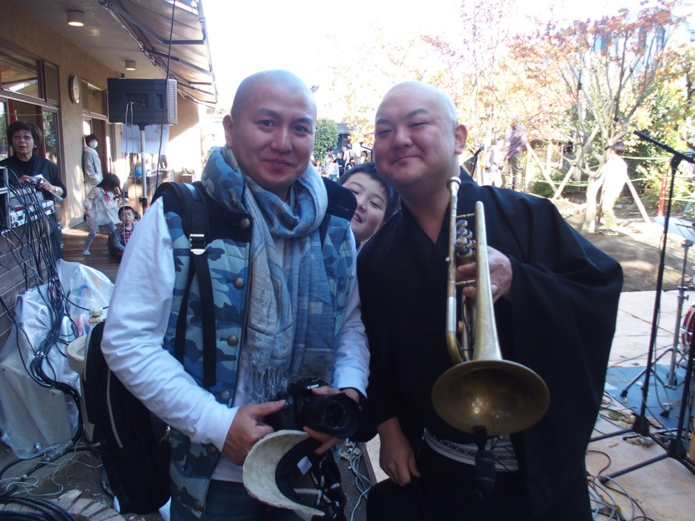ところで、先日、加須の龍興寺で TRI4TH でライブをやらせて頂いたのは記憶に新しいと思いますが〔TRI4TH、加須龍興寺で『わらべ JAZZ』と『寺ごころ』ライブ参照〕、ここの住職がわざわざ会場まで足を運んで下さいました!…最初、姿がカジュアル過ぎて誰だか分からなかったのですが(右上写真参照…笑)、なんと夜のライブも見て頂けるとの事。大変有り難く、そして自分達もより気合いが入る瞬間でもあったのでした。