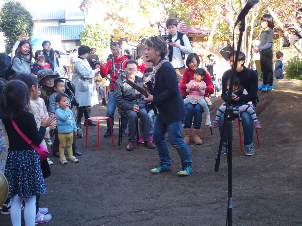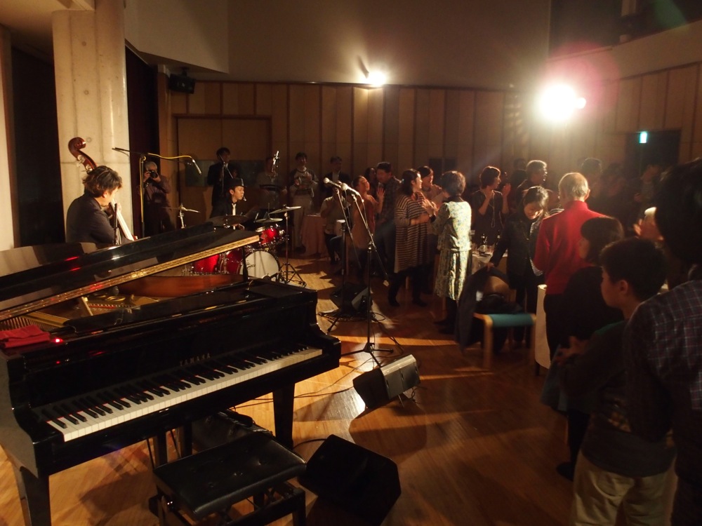 連日、寒い日が続いていたので、群馬県での朝からの野外演奏は、相当な防寒対策が必要かと思っていたのですが、天候にも恵まれ、むしろコートが要らないくらいの暖かさでした。天気が良いと、当然お客さんも多くなるもので、この『わらべ JAZZ』では家族連れの方達を中心に、沢山の方に楽しんで頂けたようです。…楽しみ方は人それぞれですが、身体を揺らしたり、走り回ったり、客席内に出て来たメンバー達とハイタッチしたり…、和やかな時間が過ごせました。
